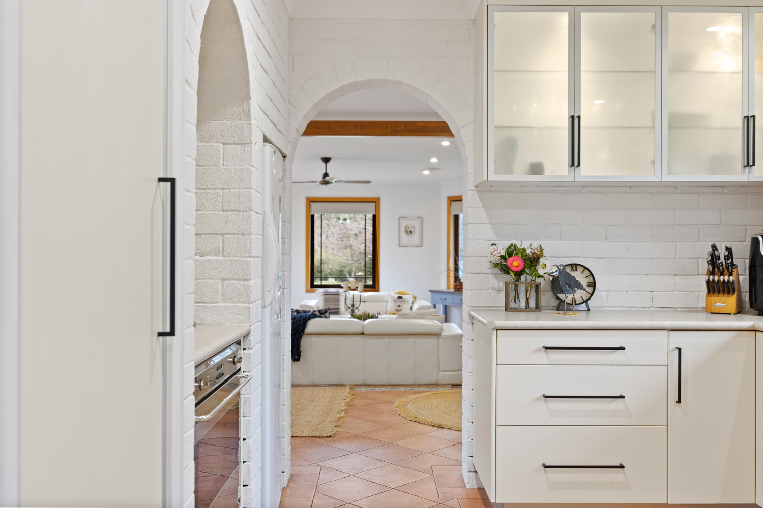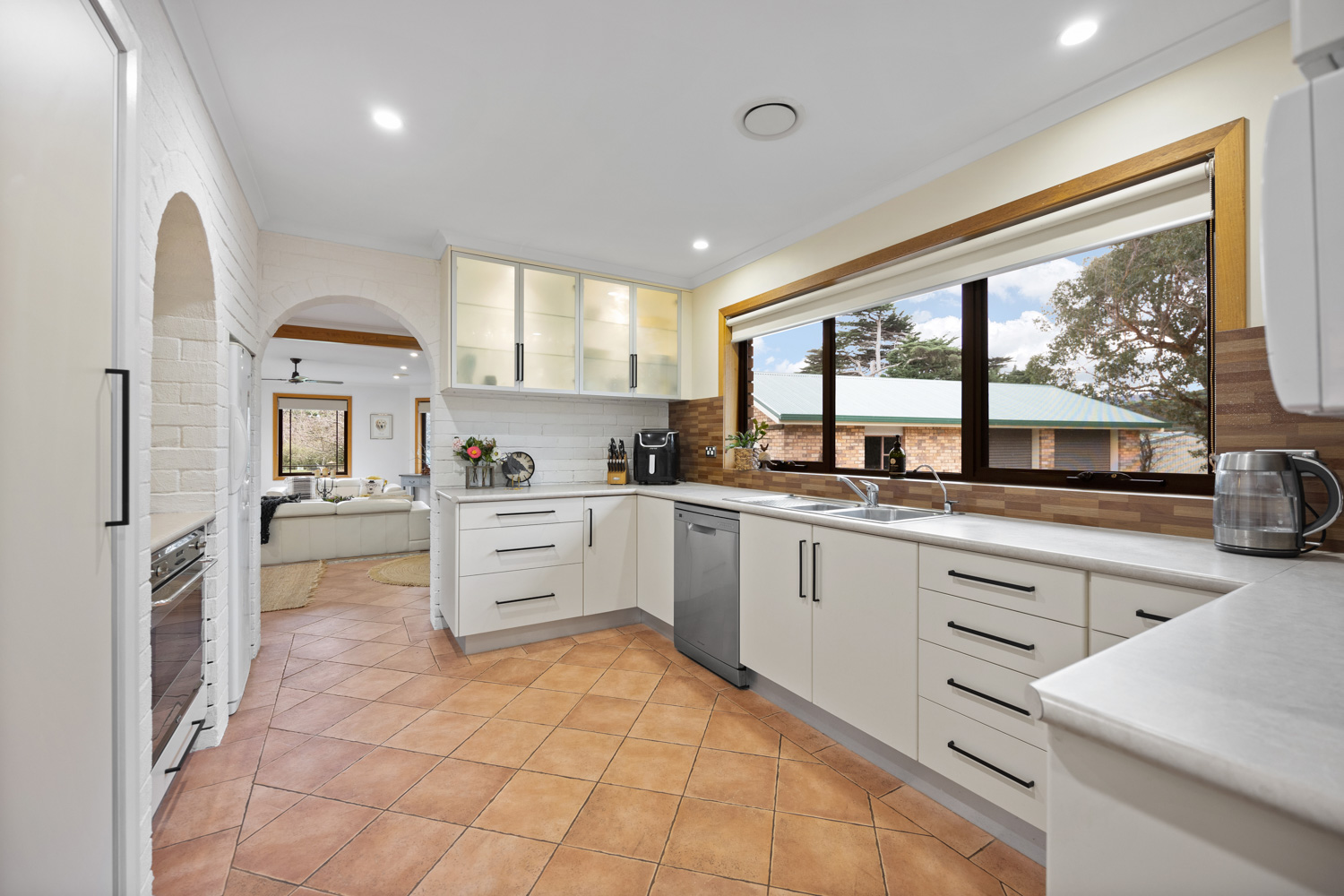 The kitchen features a Smeg 900mm oven with gas burners, many cupboards for ease of storage, a walk-in pantry and large windows showcasing the garden.