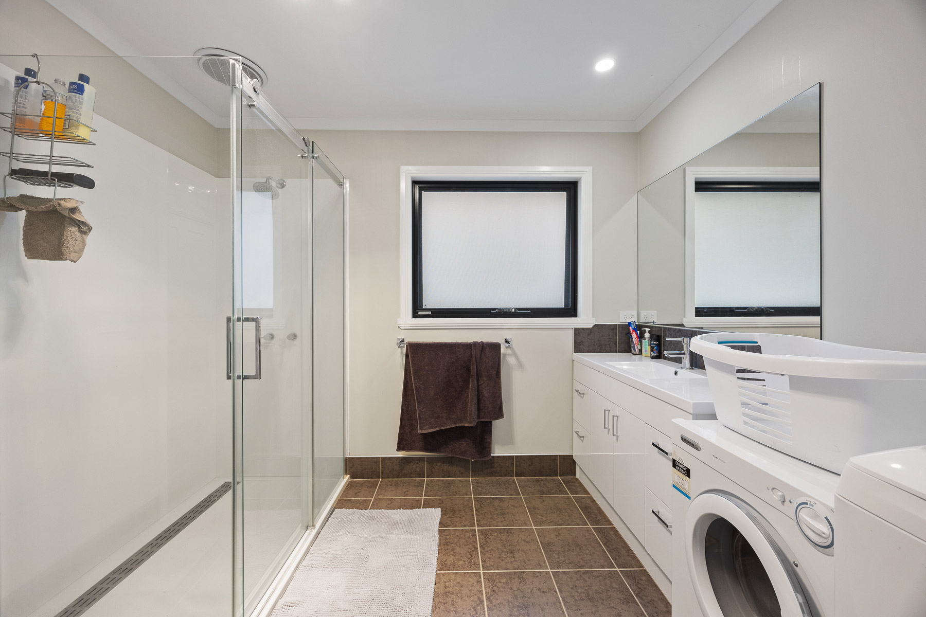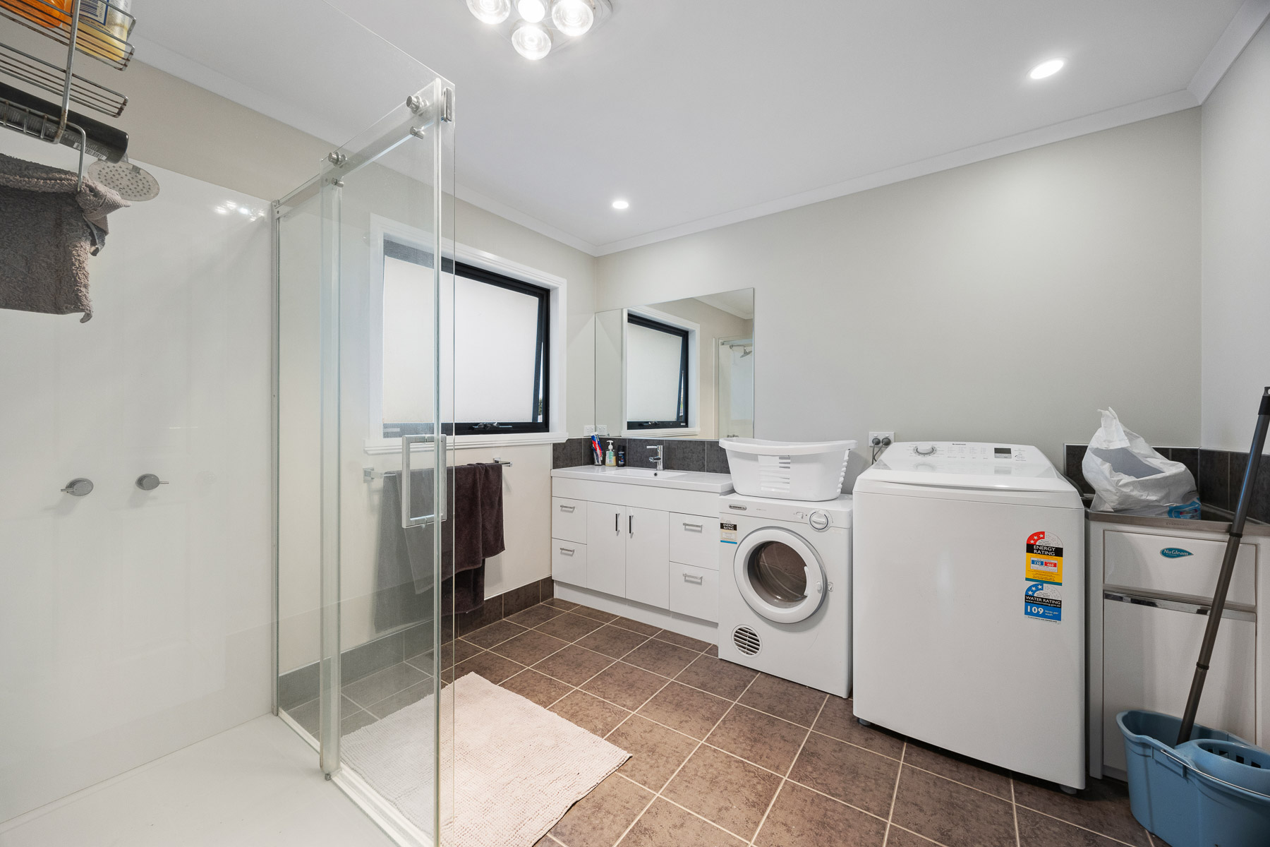 The bathroom is large, large enough for it to double as a laundry and still have space to move.