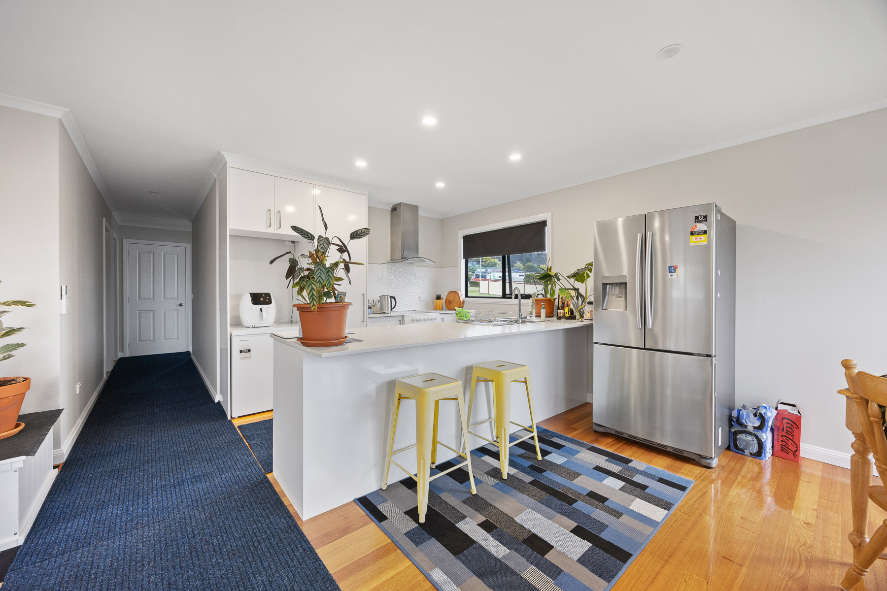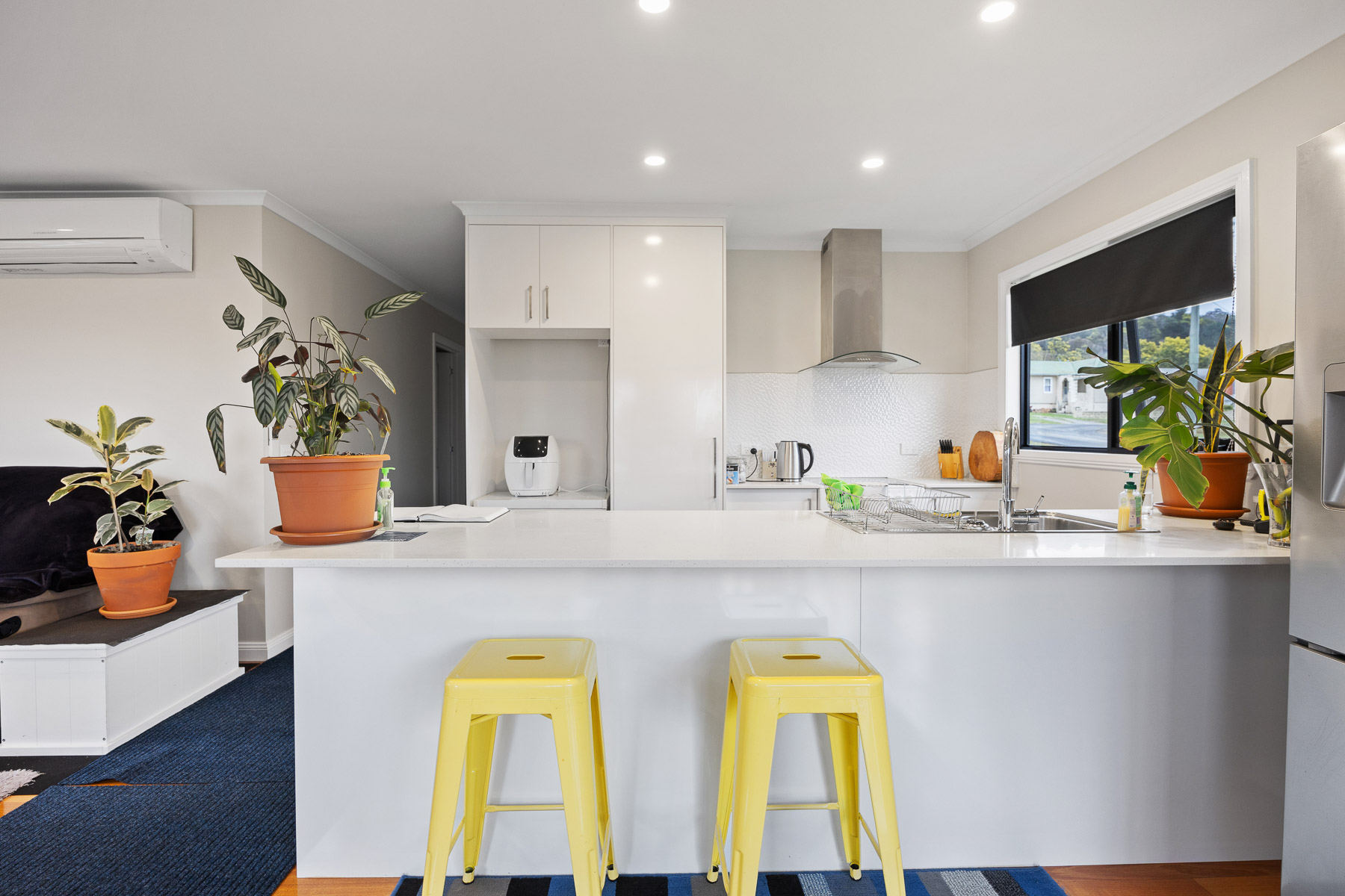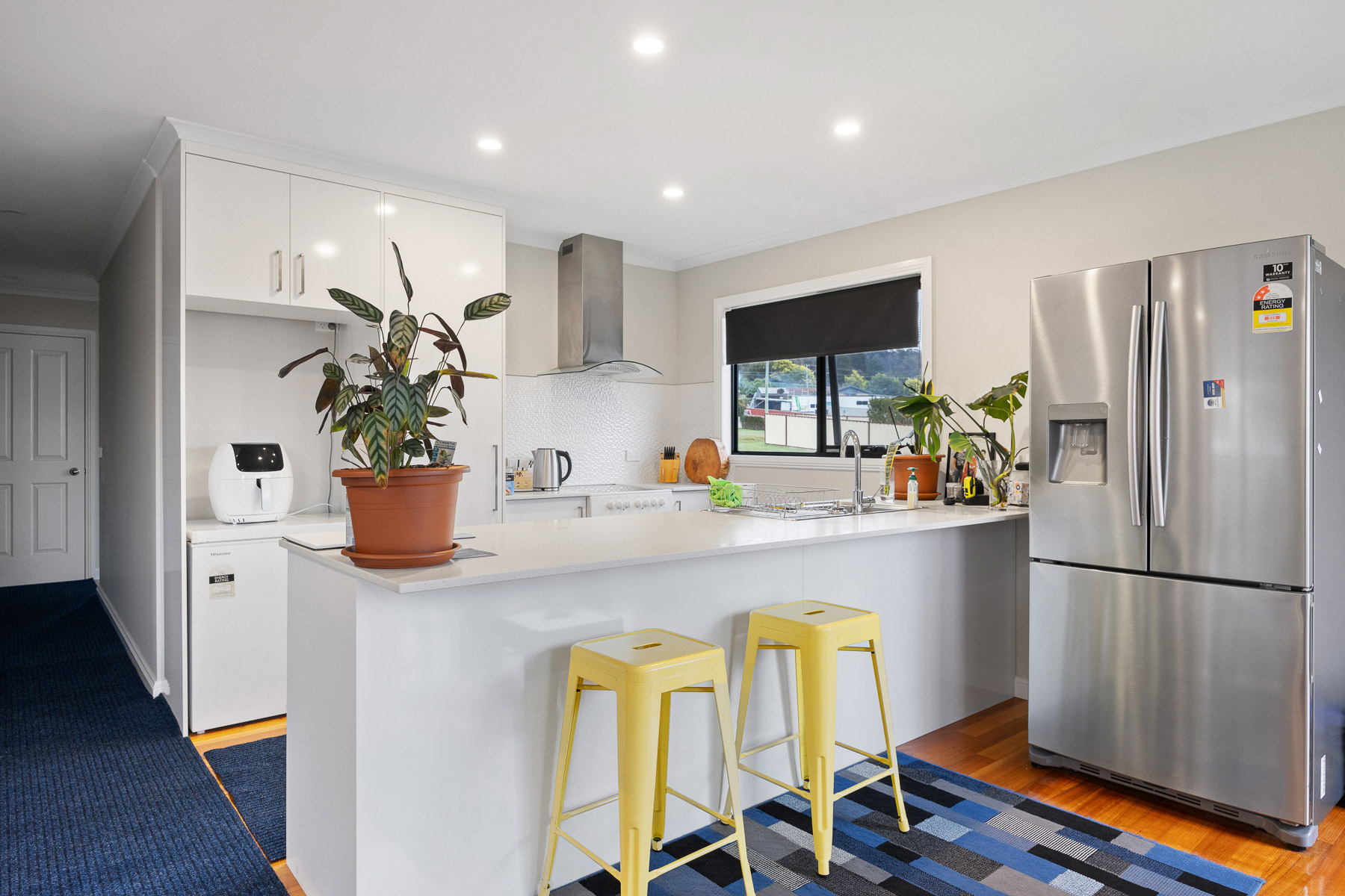 The simple but practical kitchen has an abundance of natural light, good bench space and loads of cupboards/drawers and an island bench that easily seats 4..