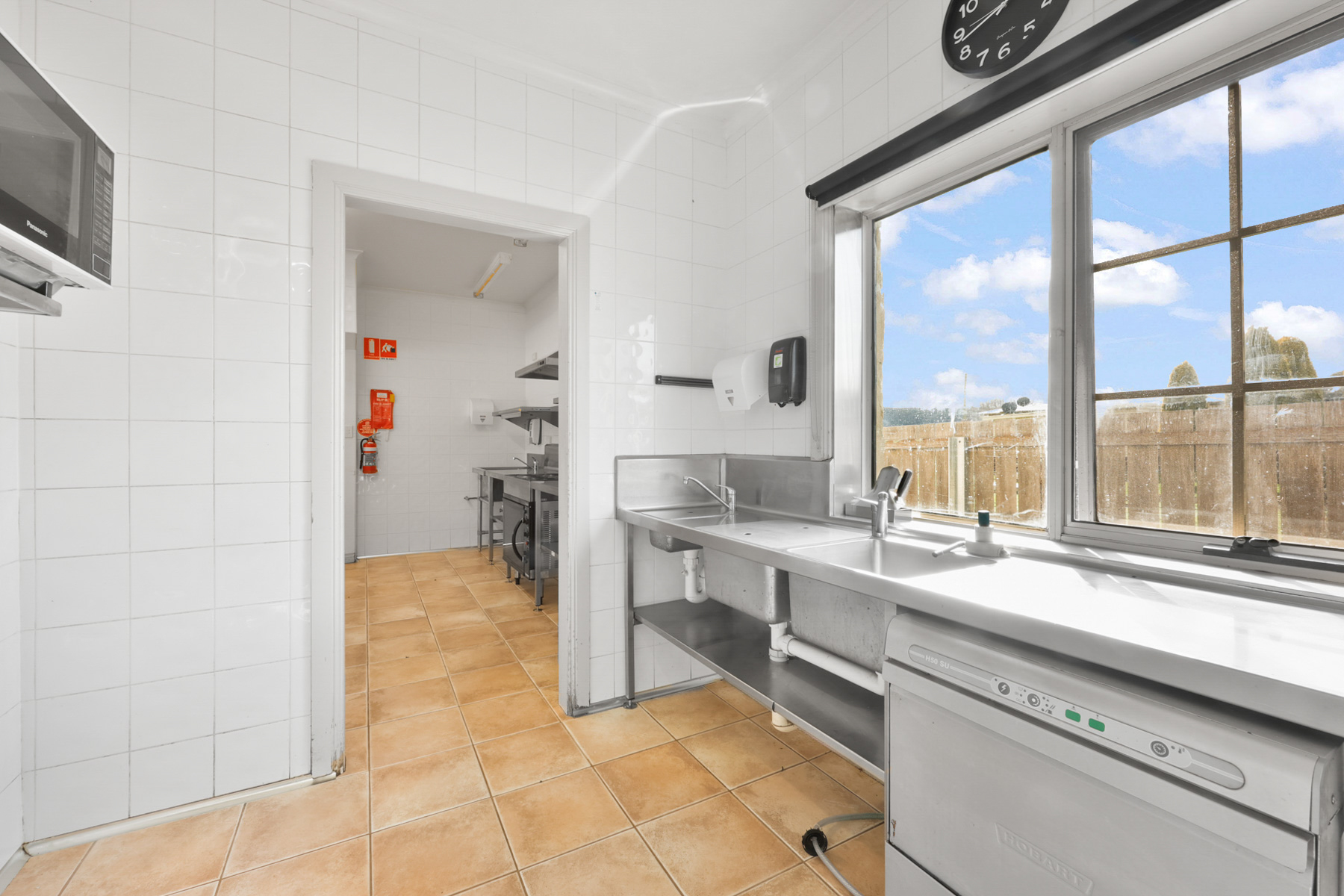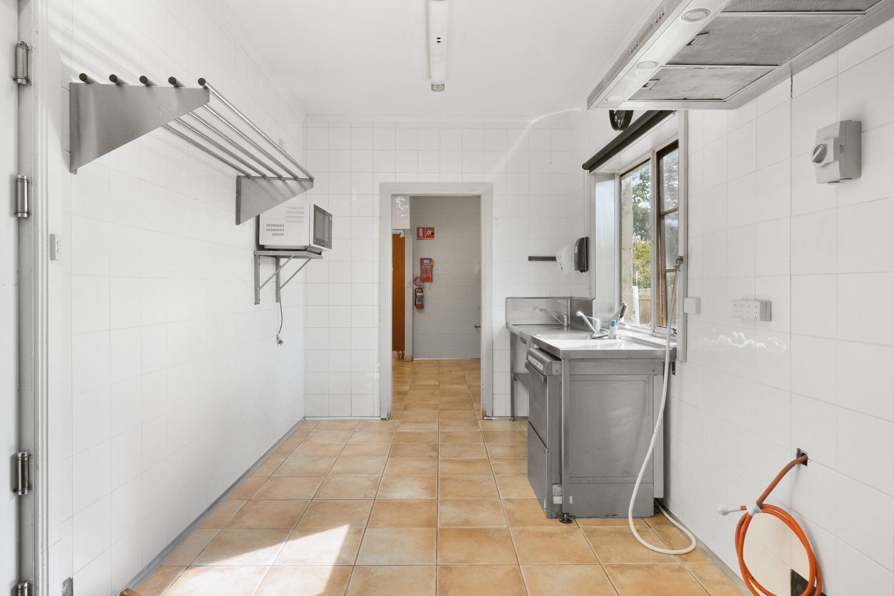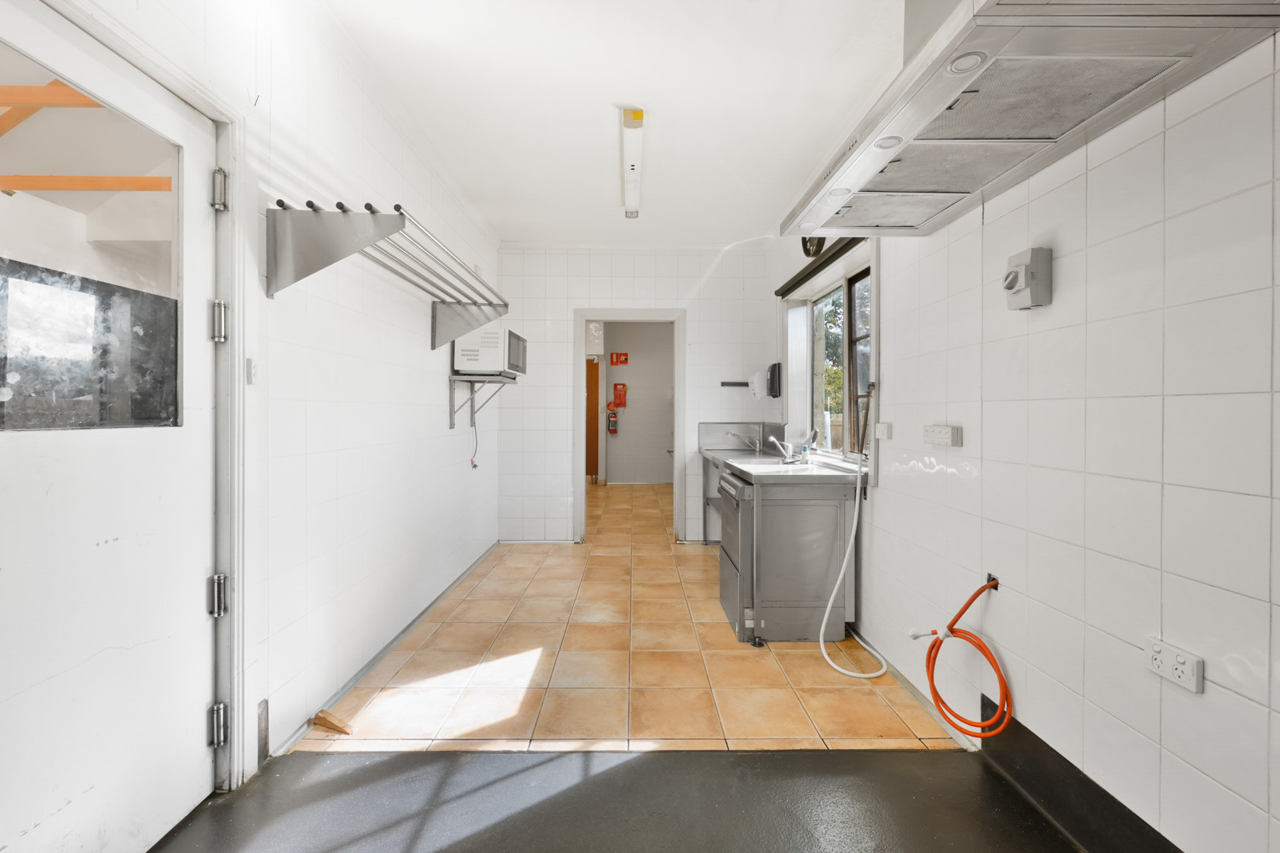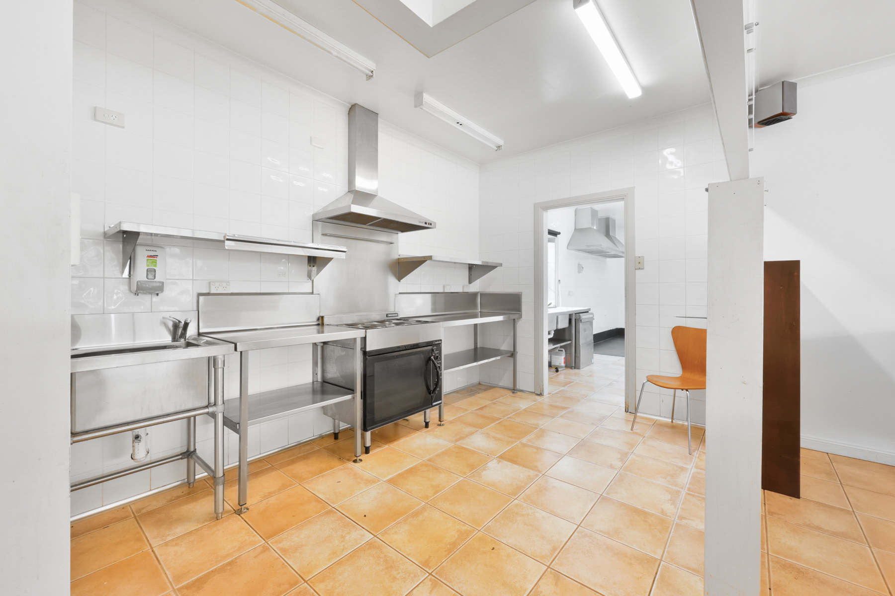• Commercial kitchen w/ stainless steel benches & sinks.