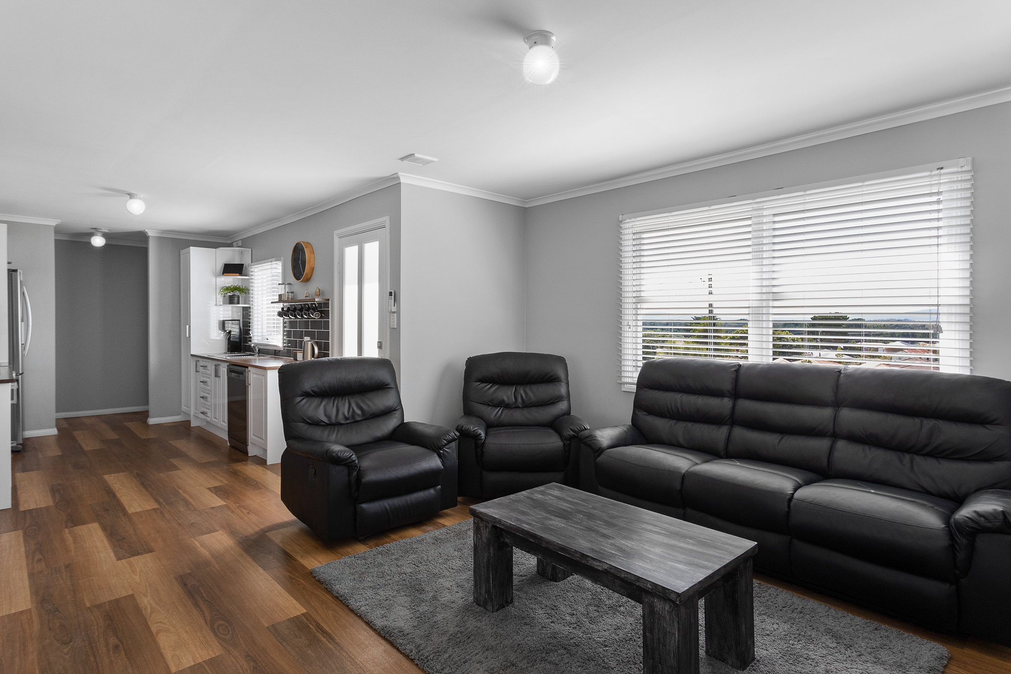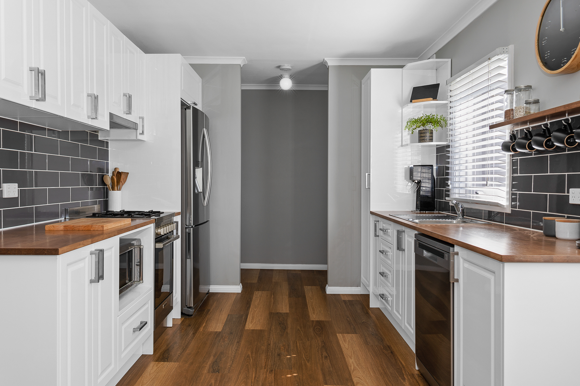 The footprint of the home is compact but well thought out and offers 2 bedrooms, a living/dining area, a wonderfully modern kitchen featuring gas cooker, and a spacious combined bathroom & laundry.