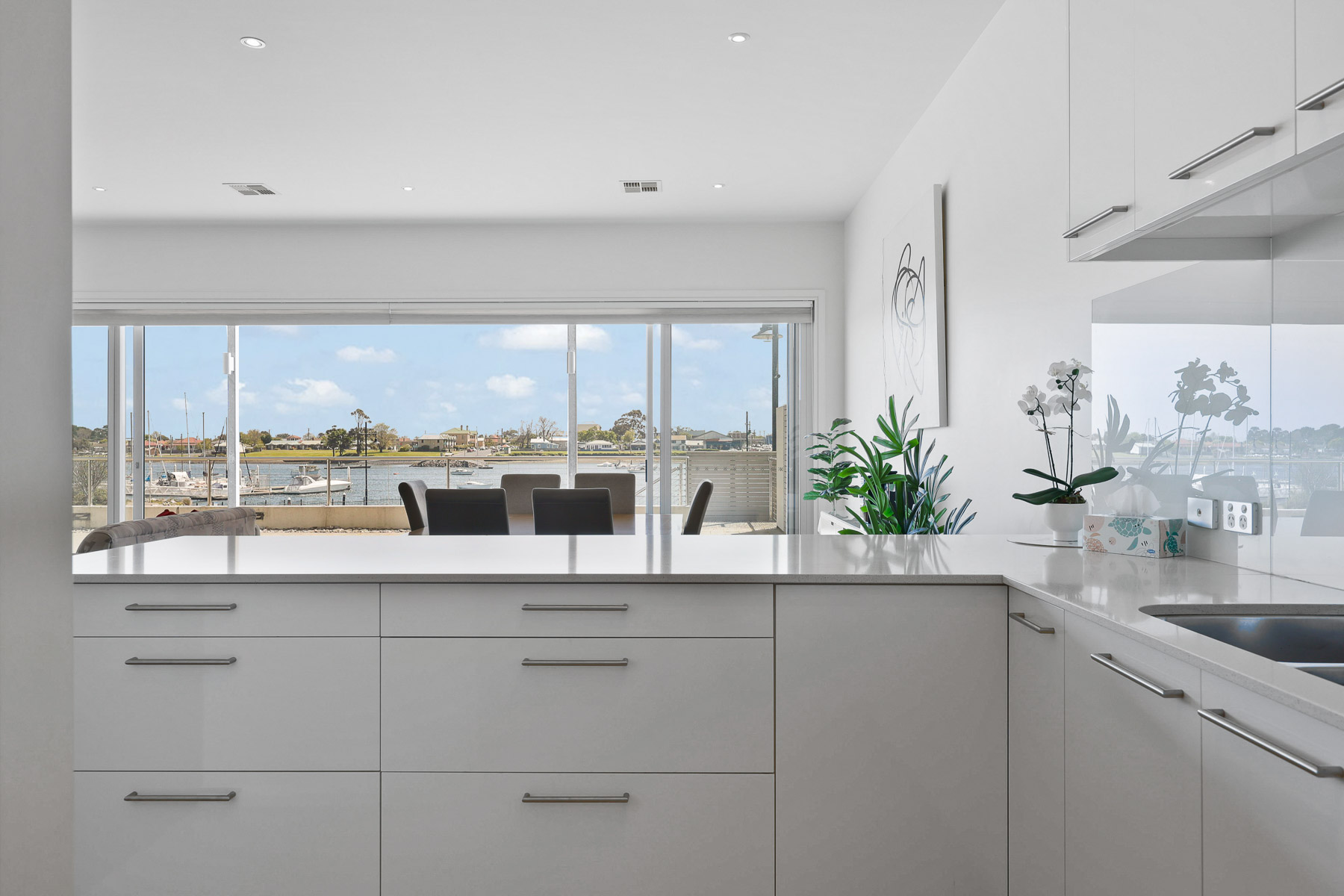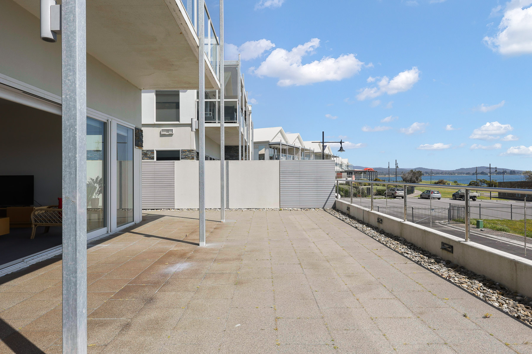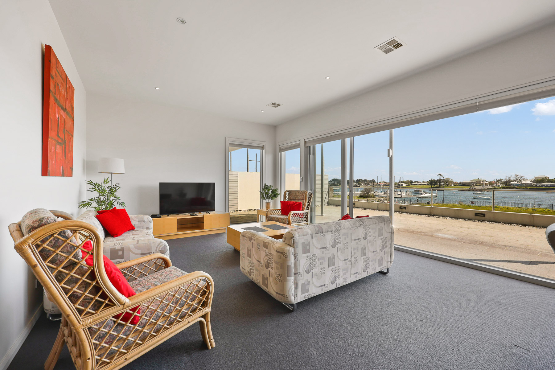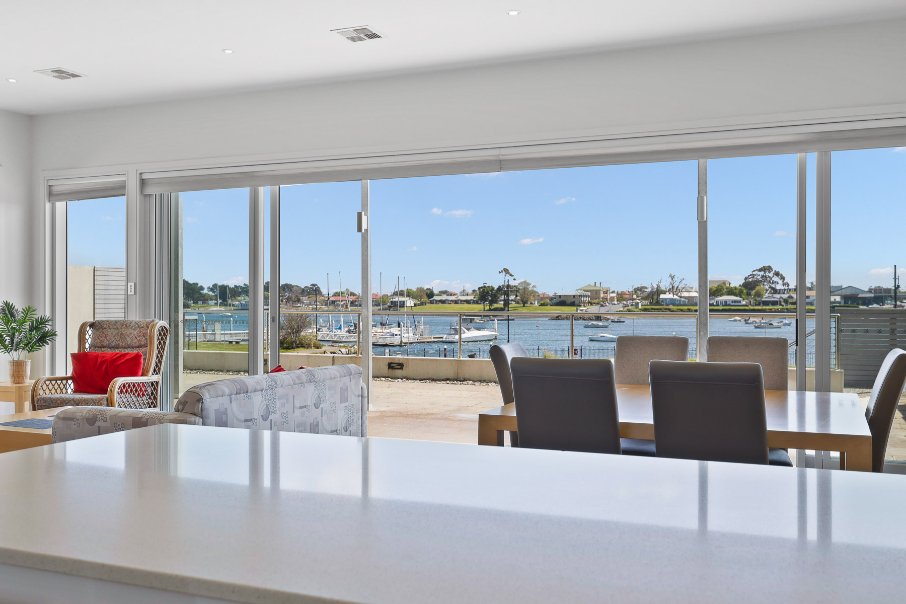 The modern & spacious living area opens out onto the paved patio giving you a glorious, all-encompassing view of the Tamar River.