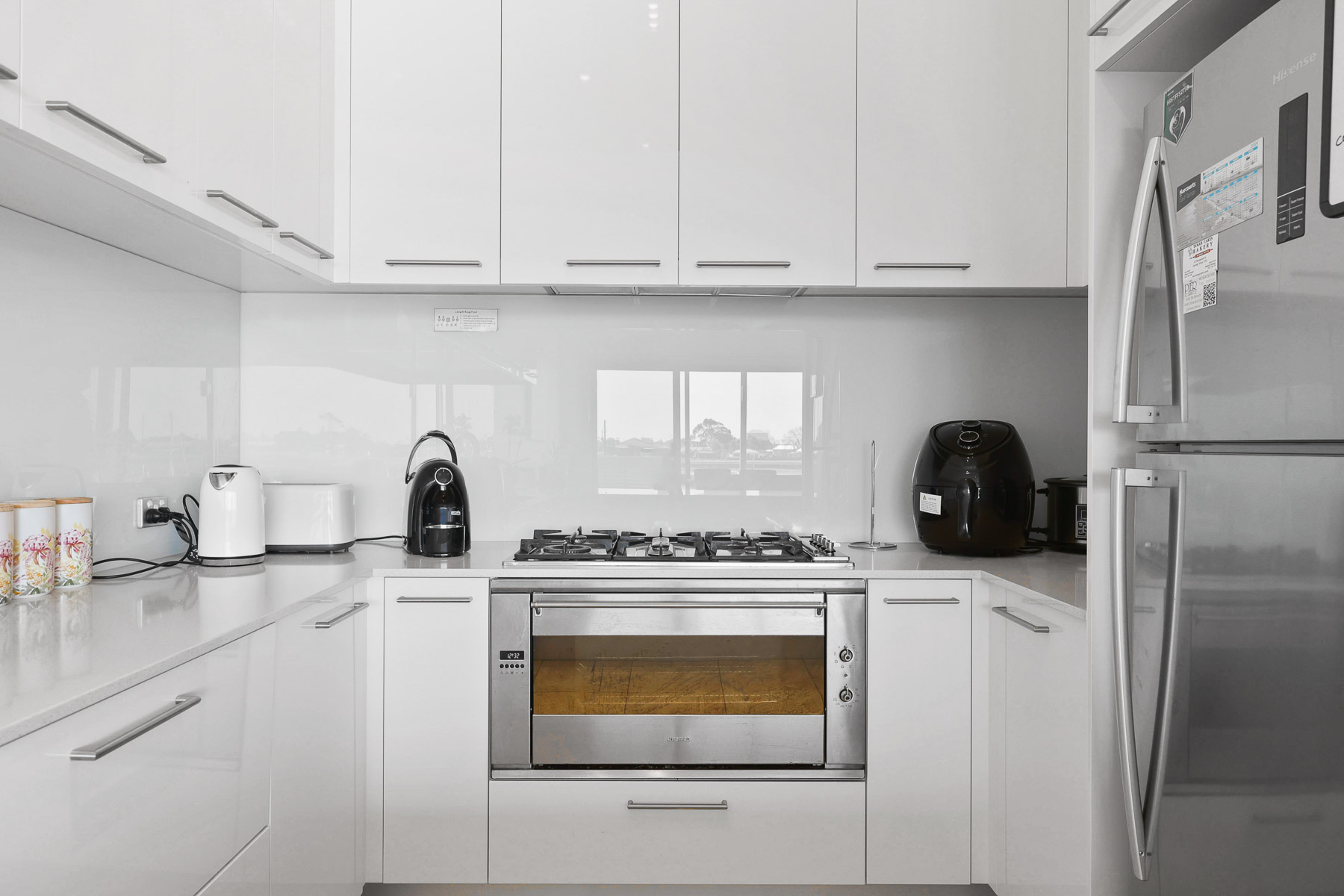 Quality Smeg appliances feature in the kitchen (gas cooktop + electric stove) along with engineered stone benchtops.