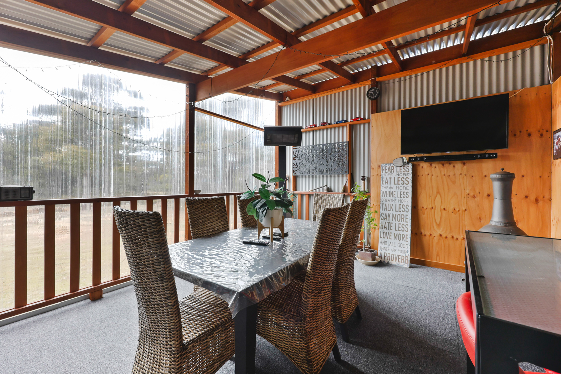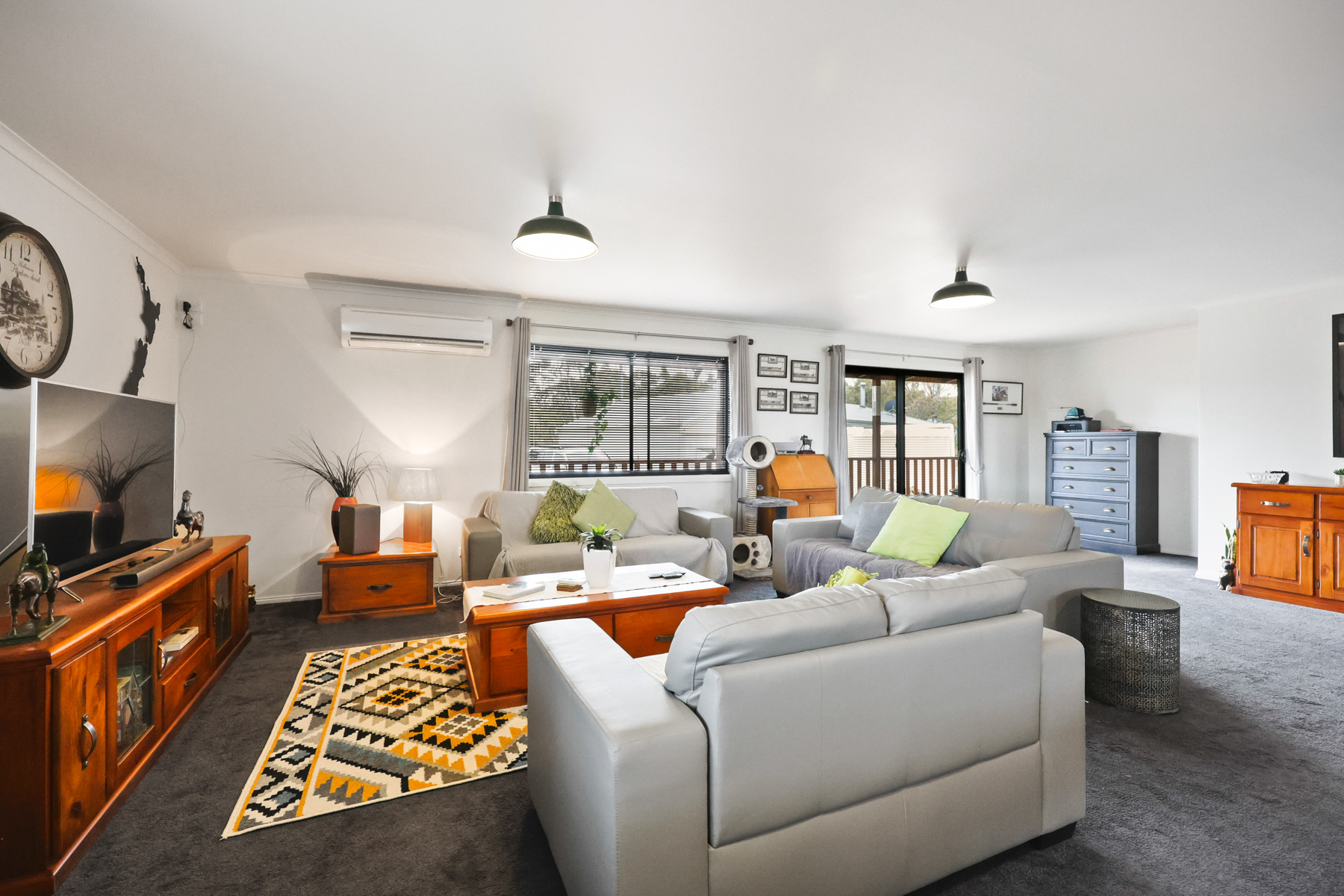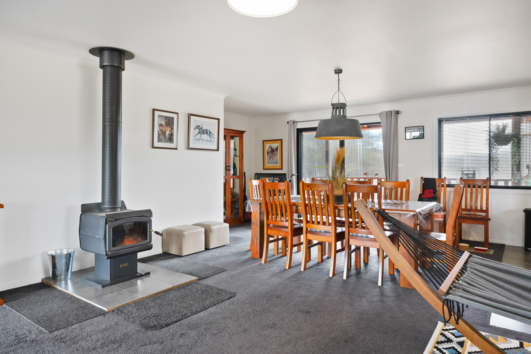 • 10m x 8m living/dining area, heated by free-standing fan forced wood fire & Mitsubishi reverse cycle