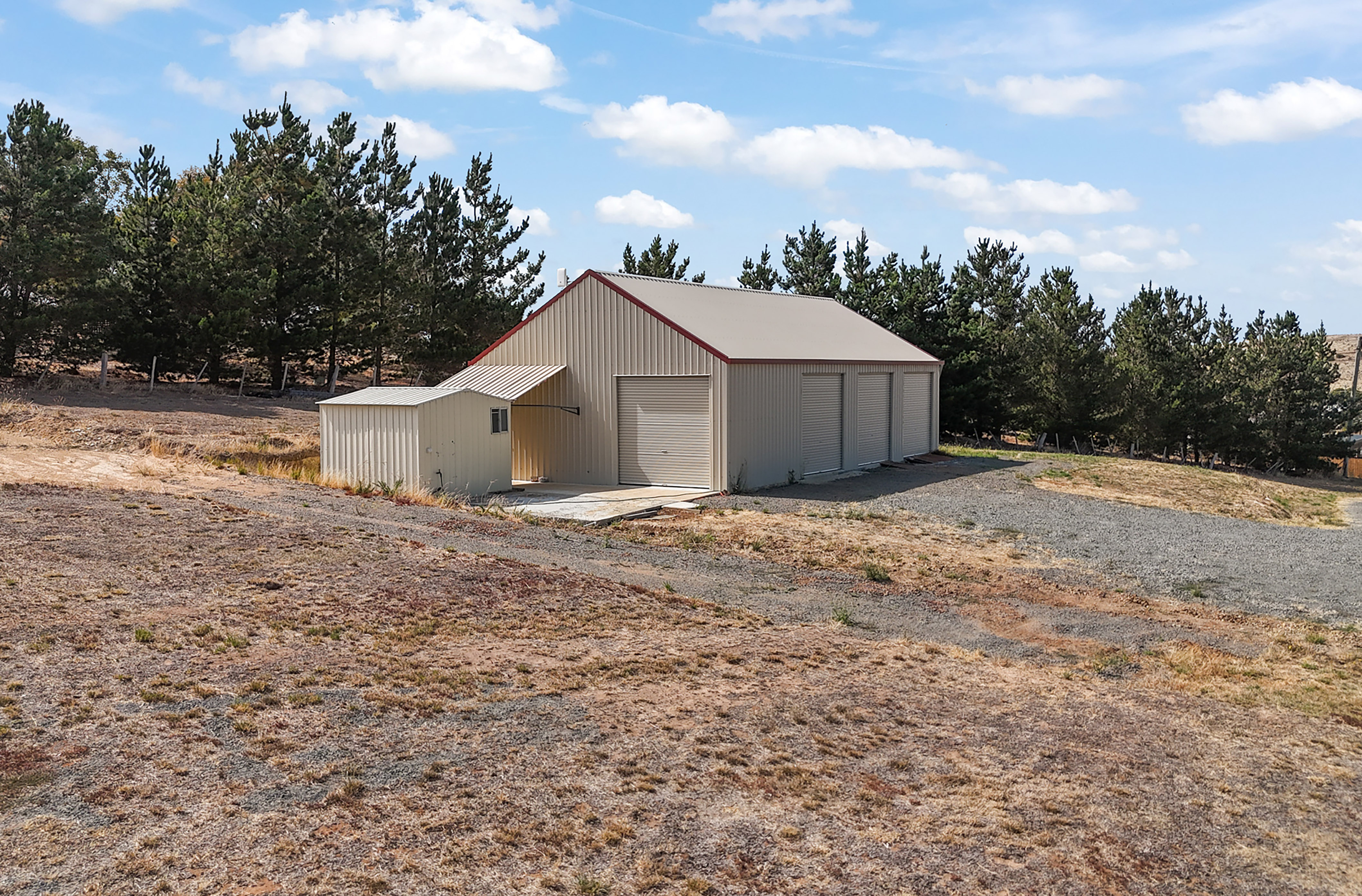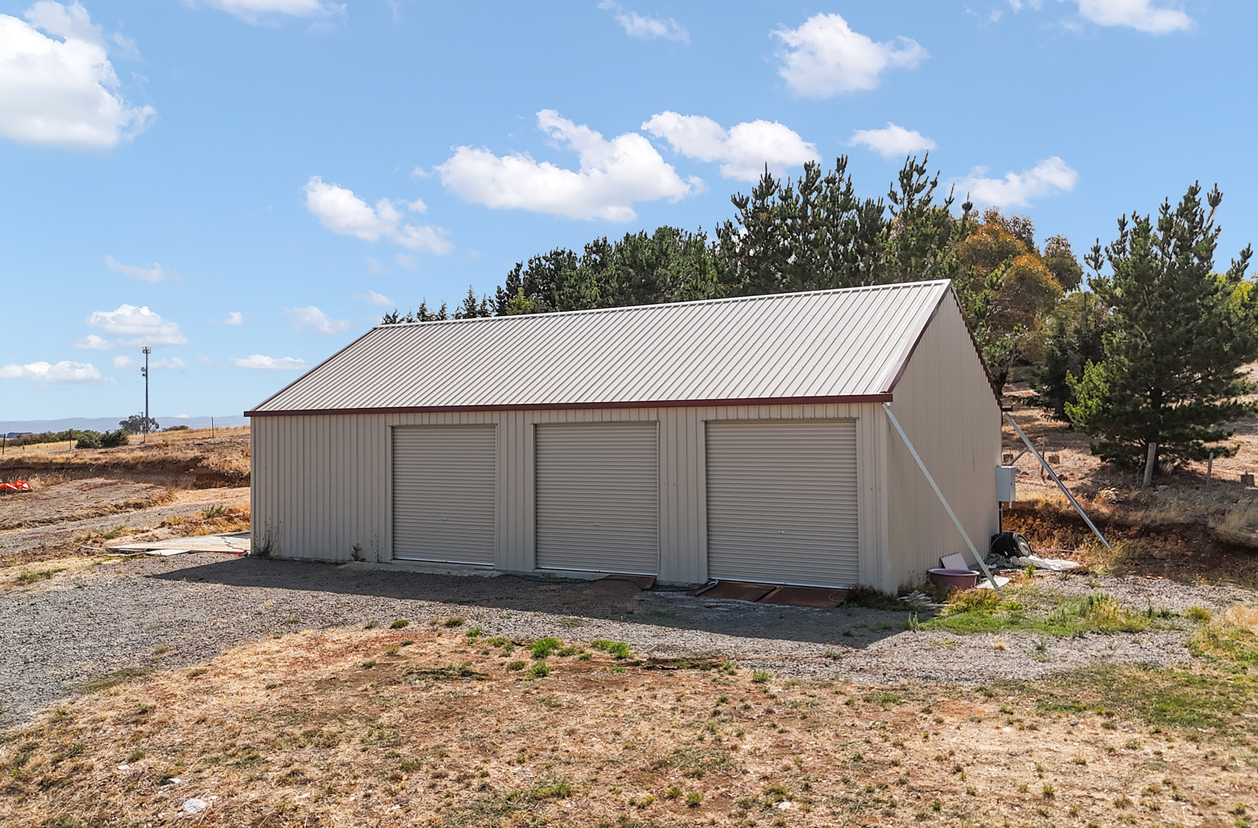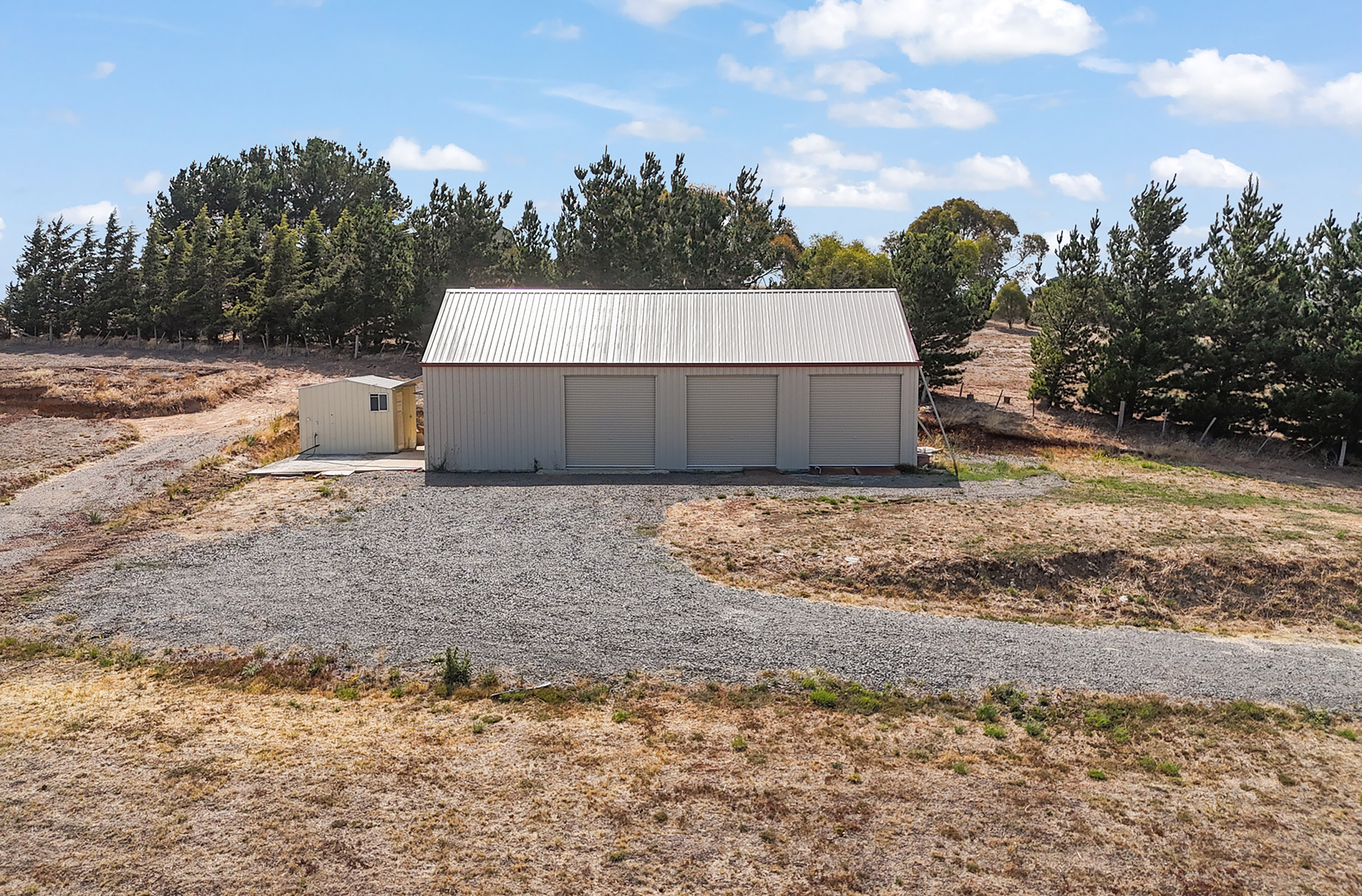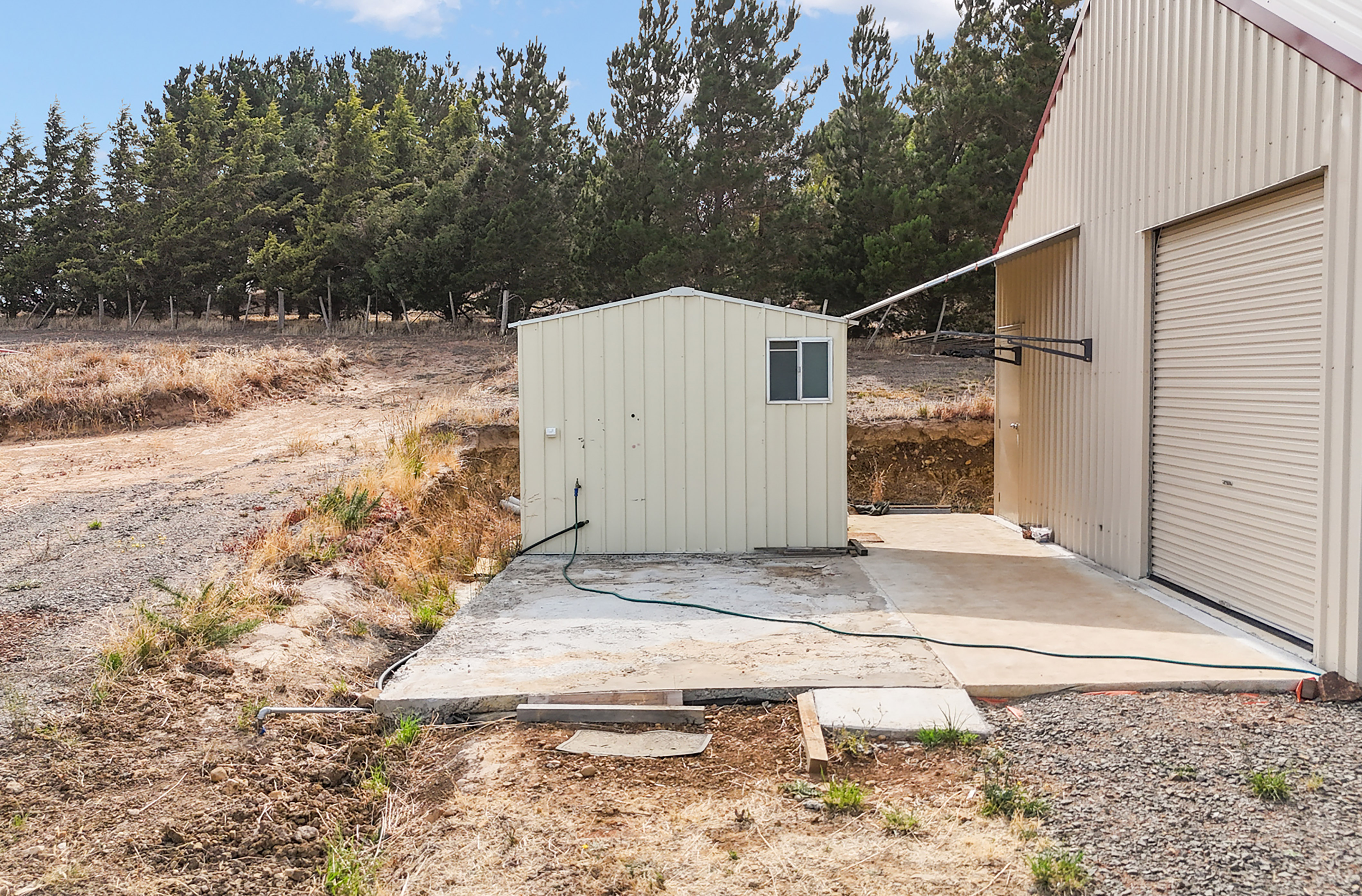 *14m by 7.5m Three-Bay Colorbond Machinery Shed. Set upon a concrete slab, the shed is ideal storage options for building materials or personal items during the construction process.