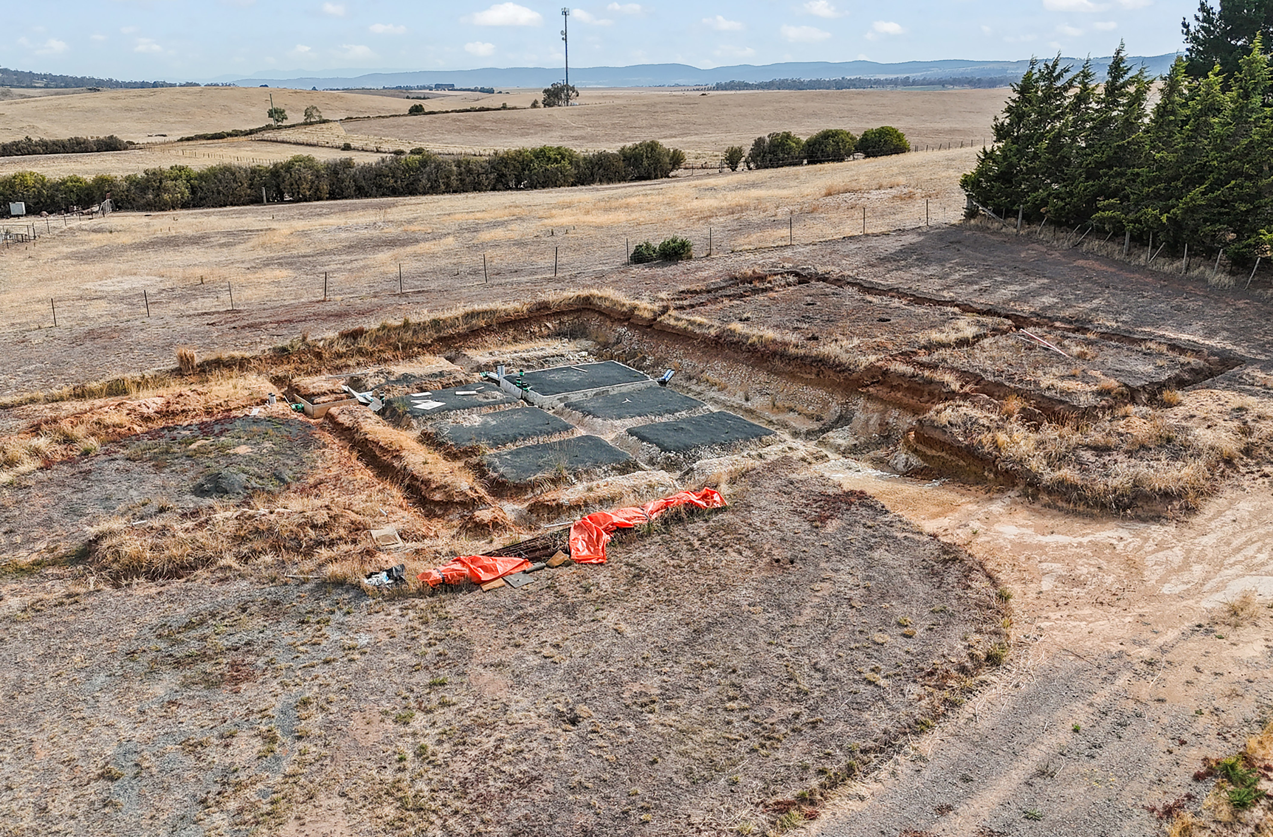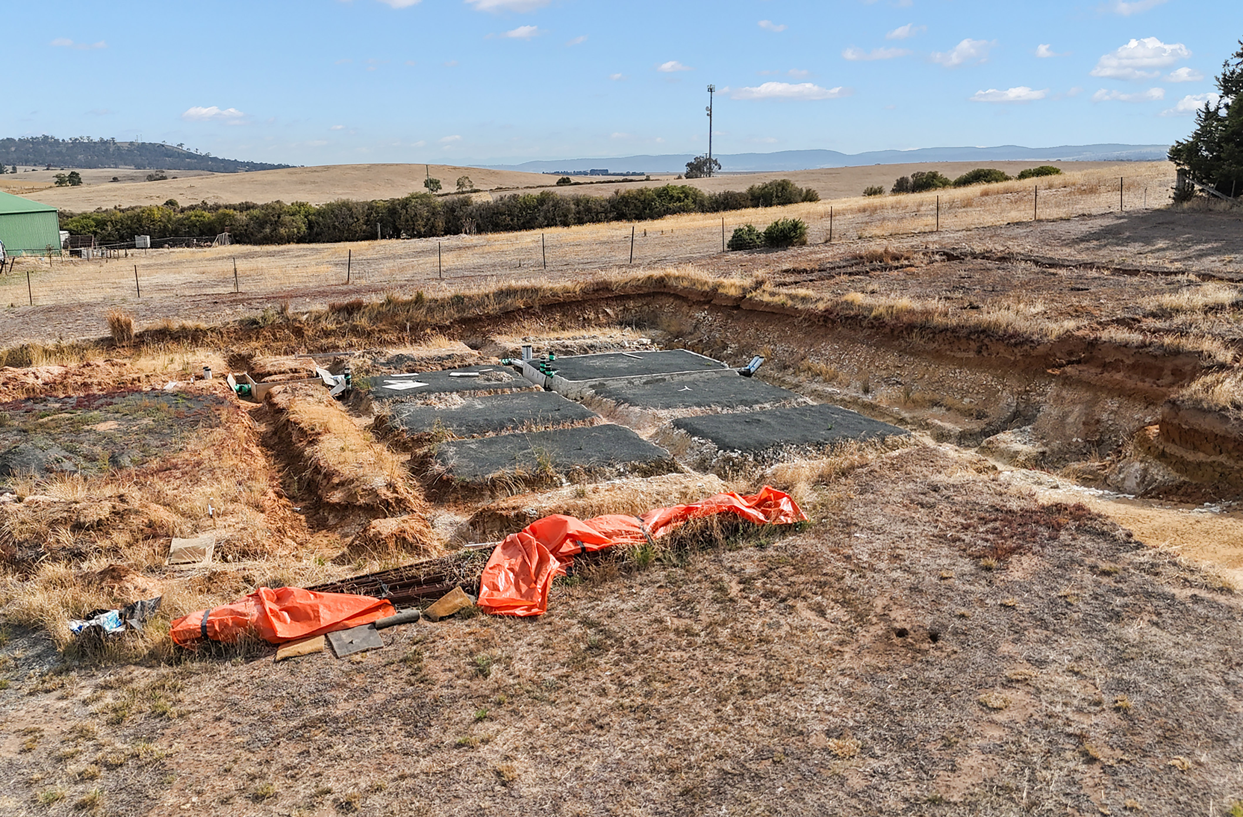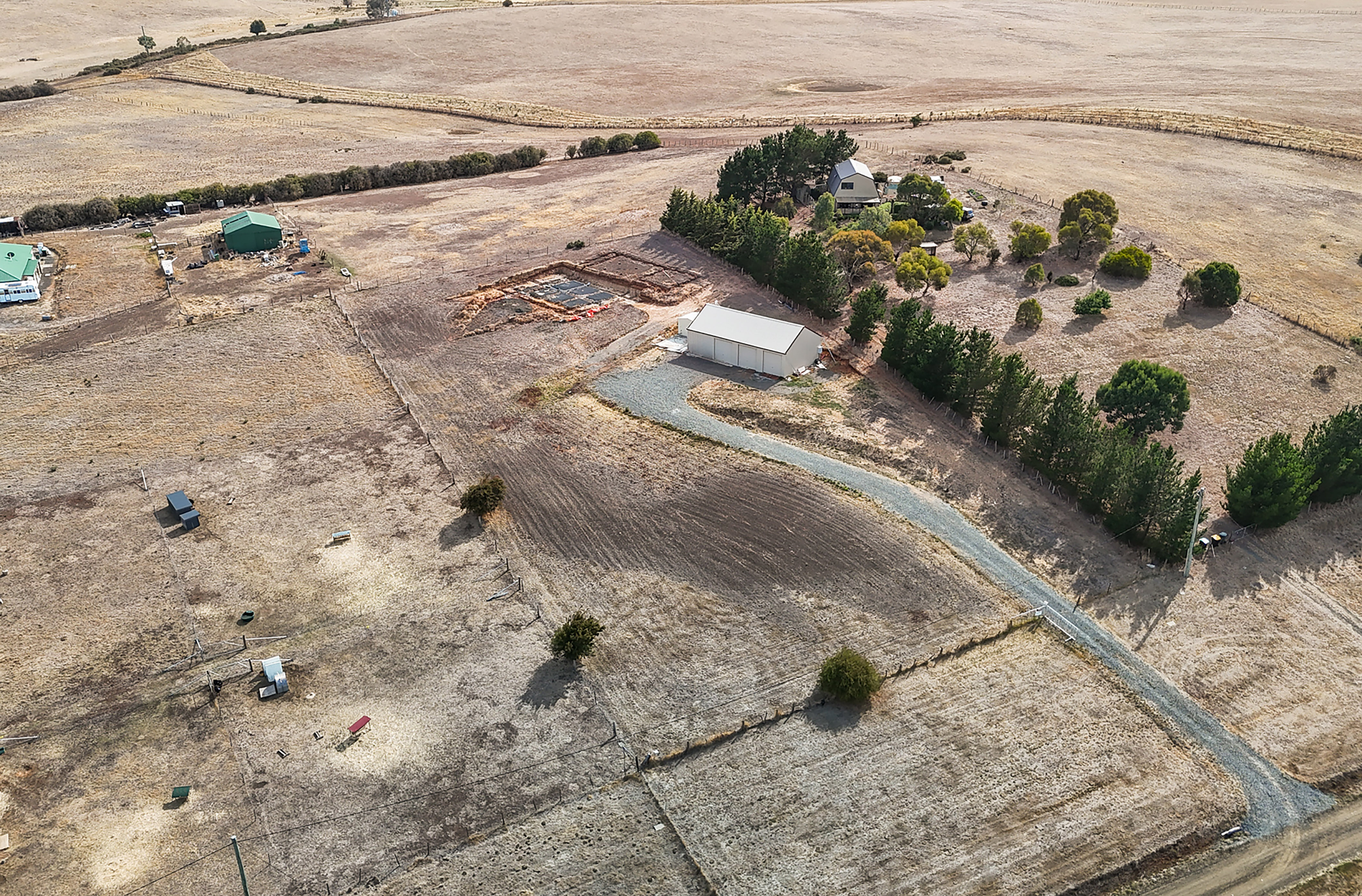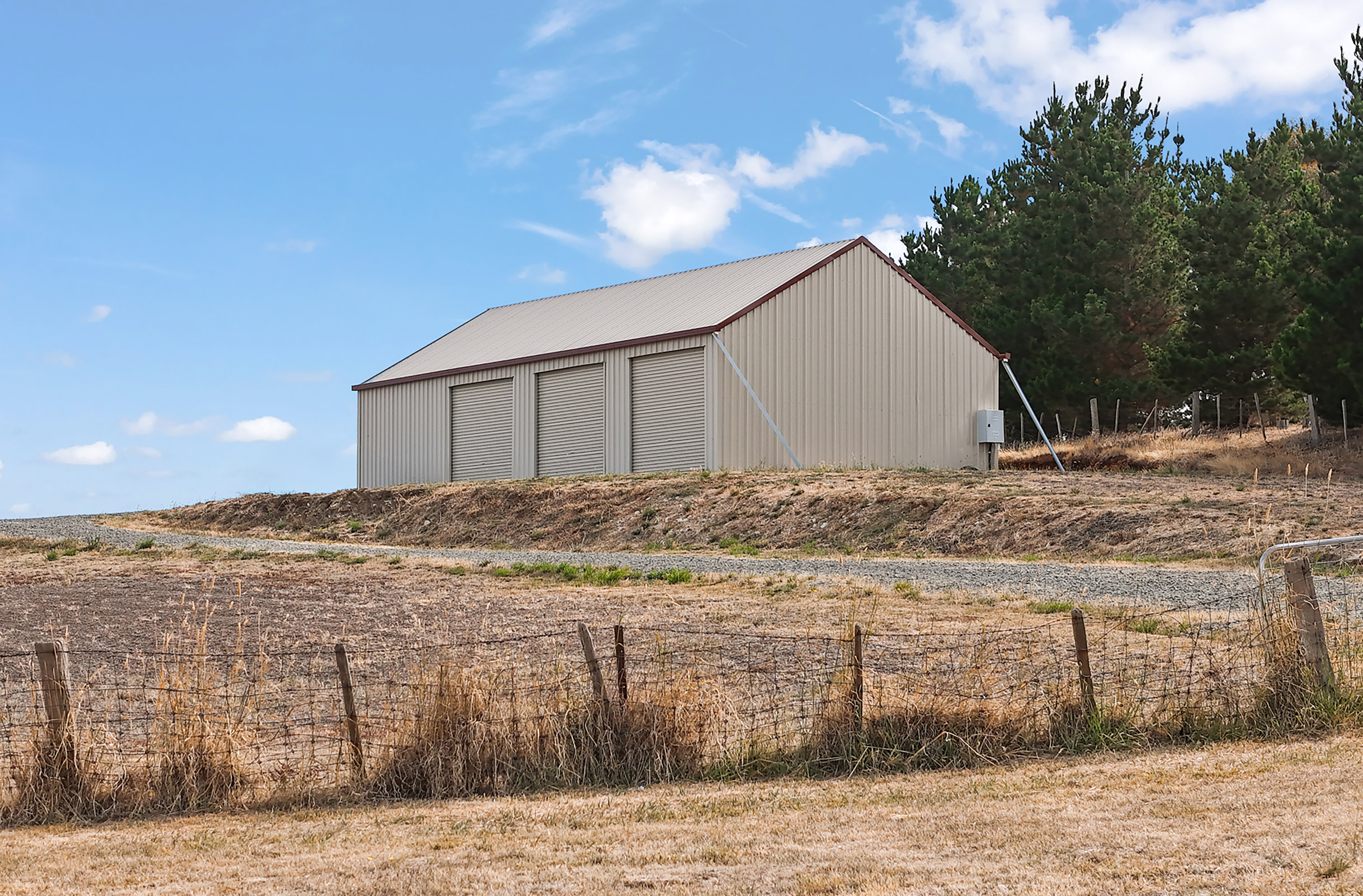 *14m by 7.5m Three-Bay Colorbond Machinery Shed. Set upon a concrete slab, the shed is ideal storage options for building materials or personal items during the construction process.