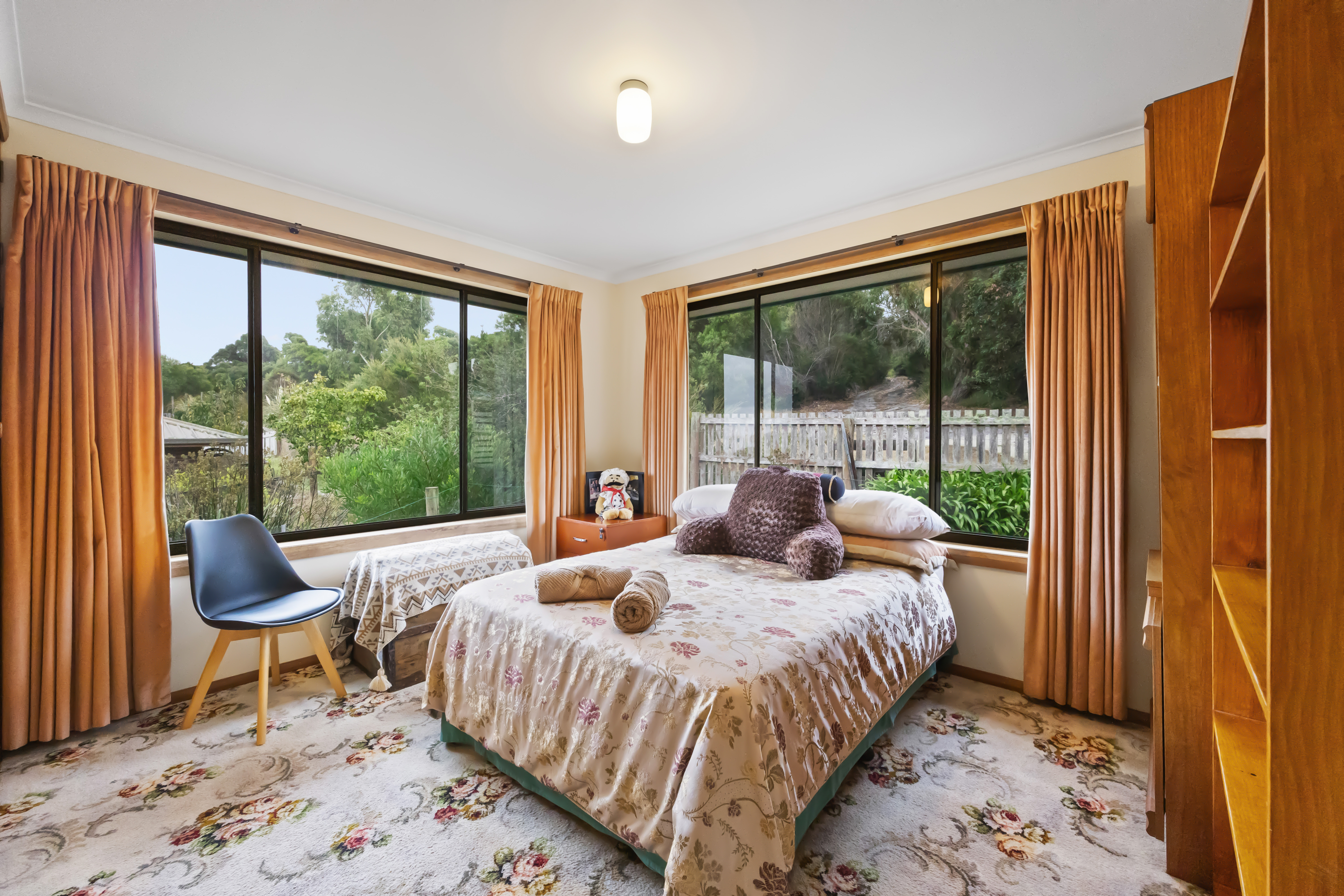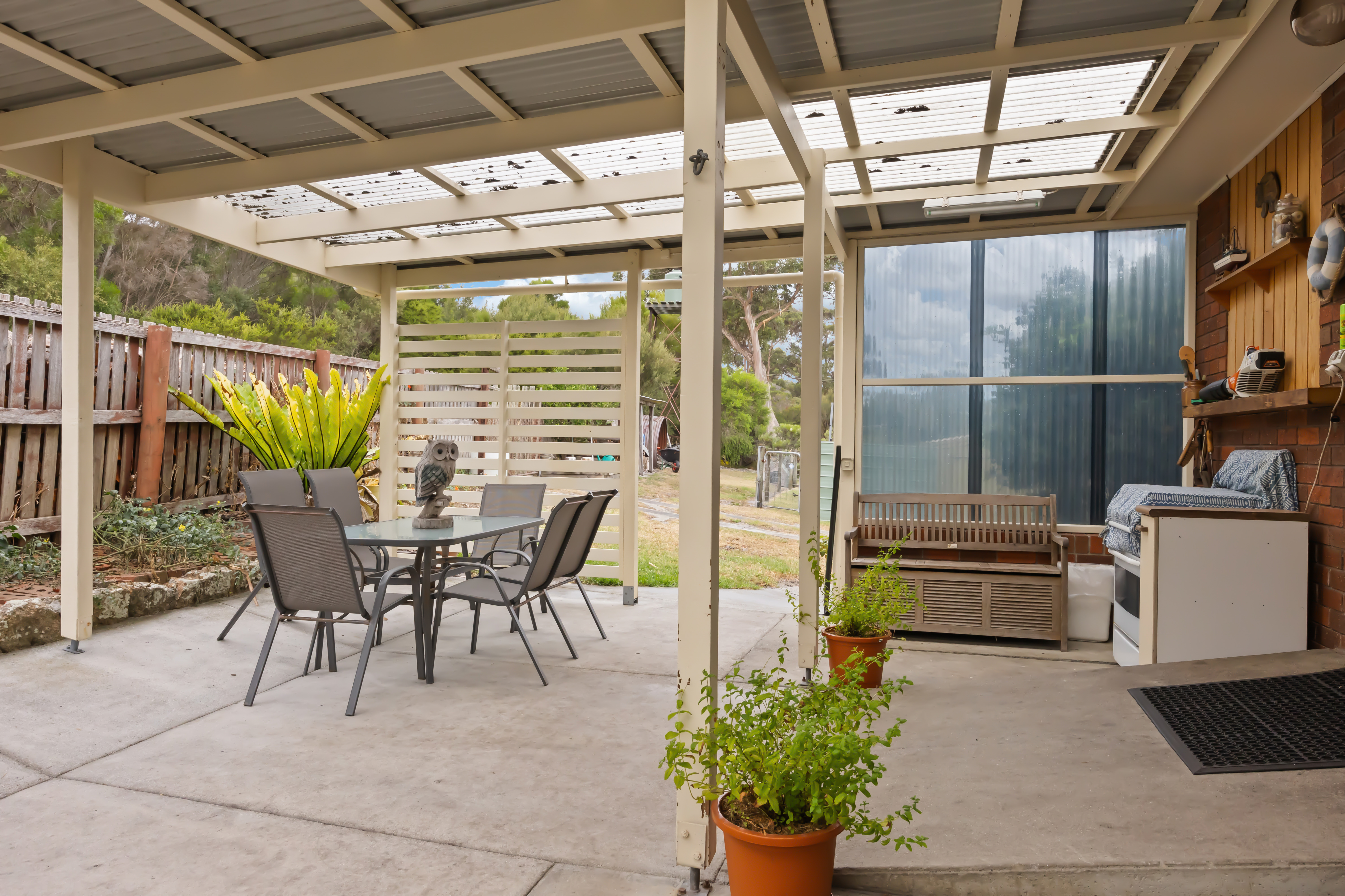 Outdoor features include a raised bed vegetable garden, established fruit trees and ample water supply from both the town water connection and large rainwater tanks. The covered back patio provides a great space for relaxing or entertaining, complete with a humble brick fire pit and outdoor cooking facilities.