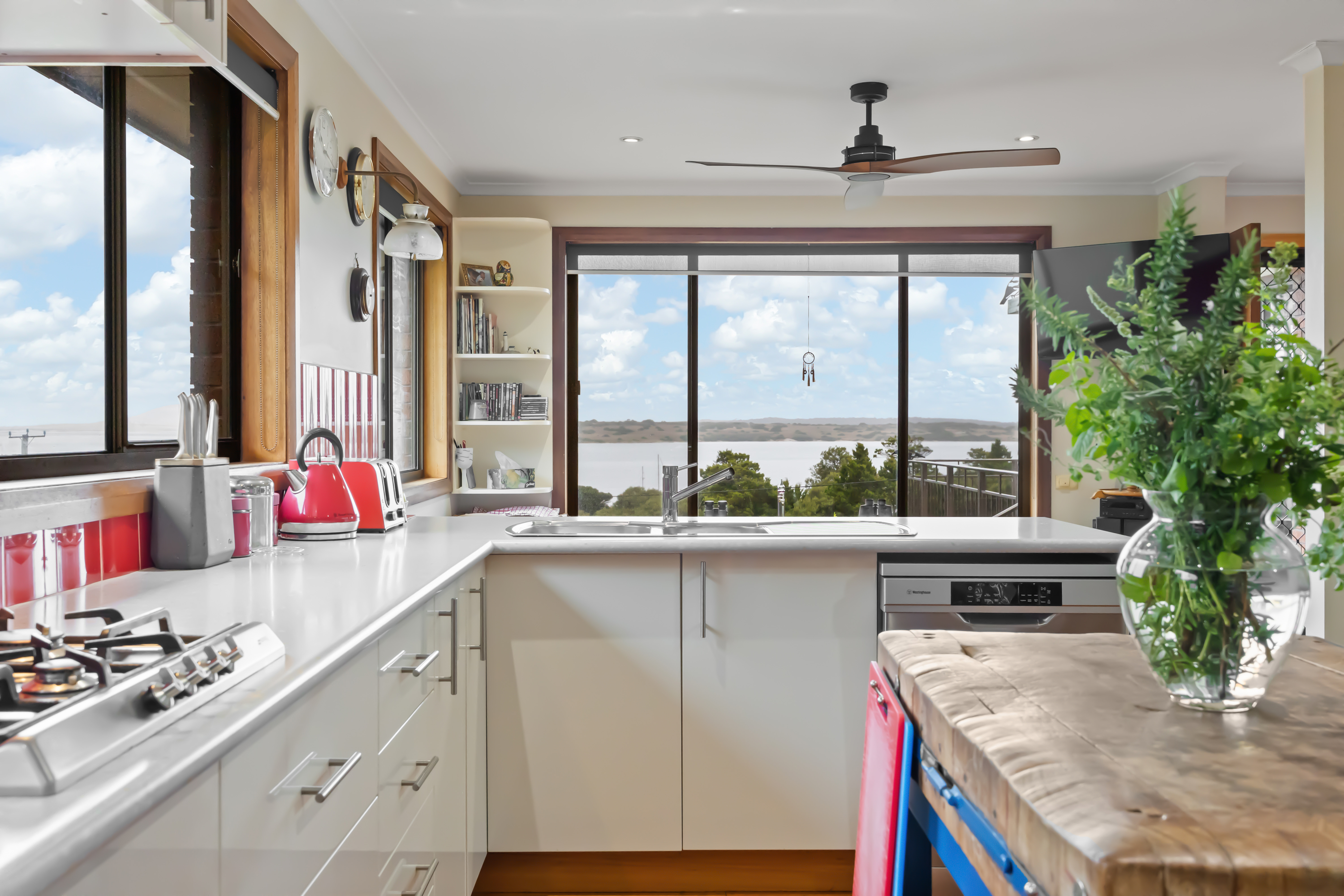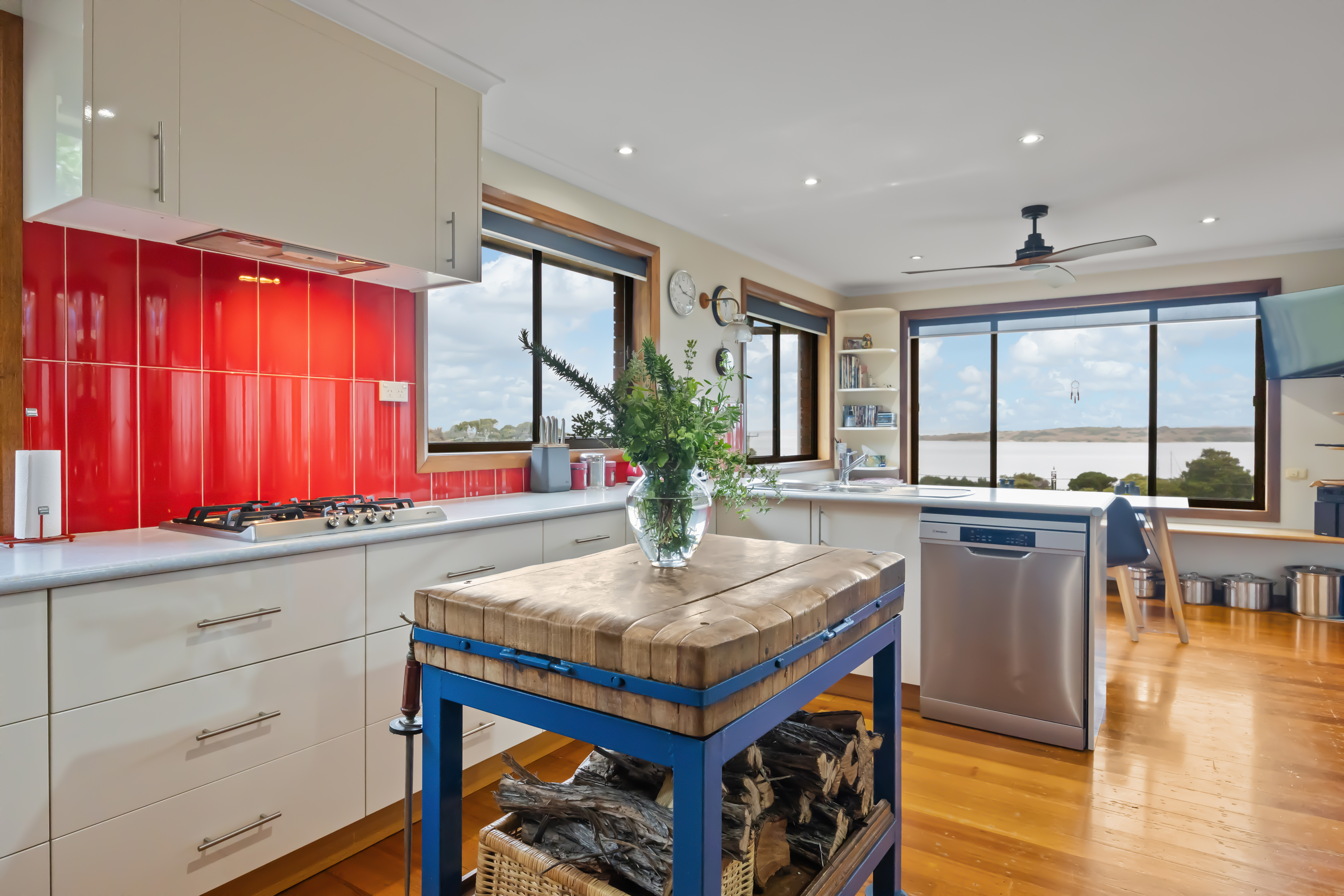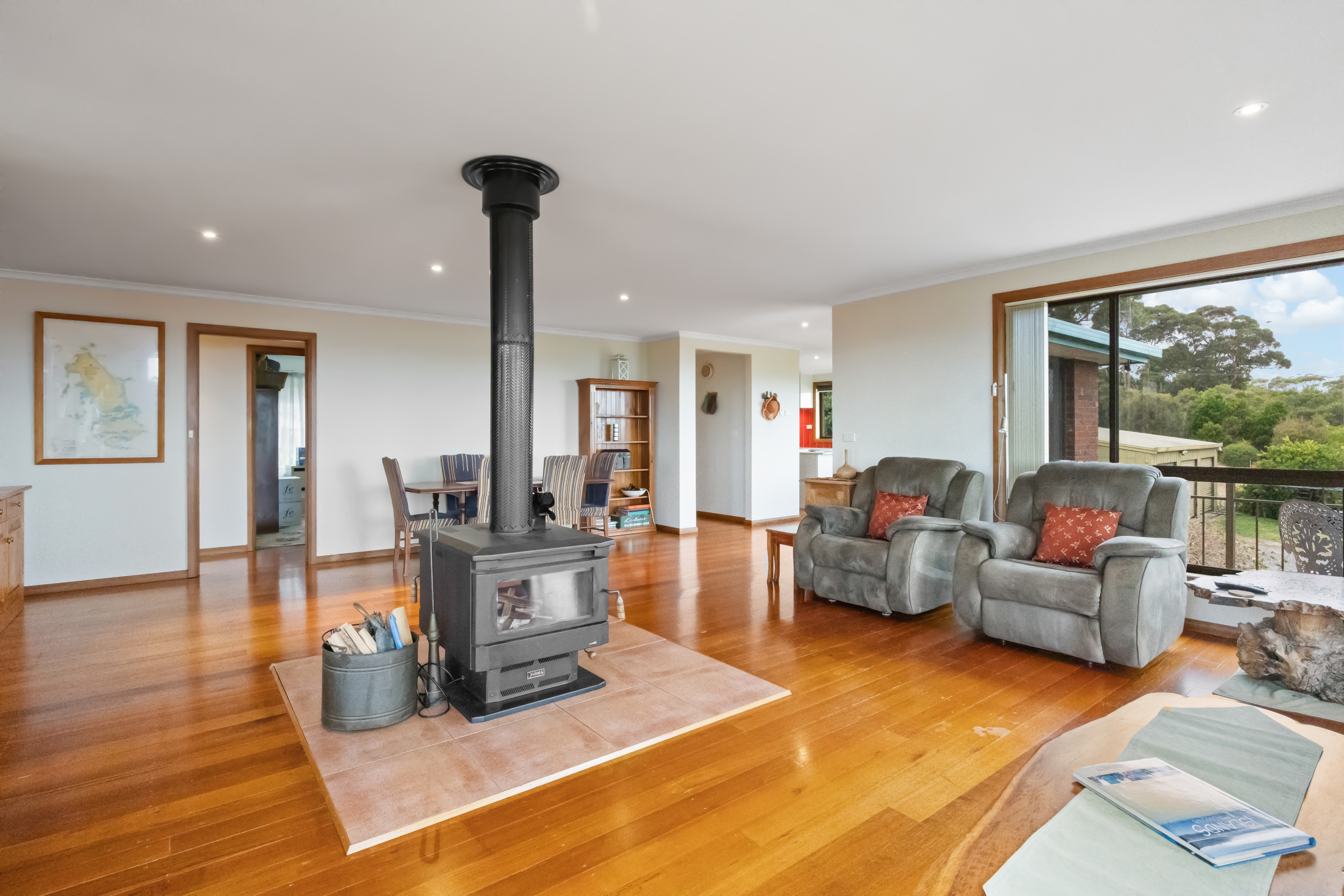 Featuring three to four bedrooms, including a spacious master suite, two of the bedrooms include built-in timber wardrobes and all are carpeted for comfort. The well appointed kitchen and dining area boast panoramic views, glossy white laminate cabinetry and quality appliances, including a SMEG cooktop. The slow combustion Thermalux stove offers wonderful cooking possibilites and as an added bonus, the hot water jacket allows you to utilize the stove's heat to heat the water providing cost-effectiveness and energy efficiency for domestic use.