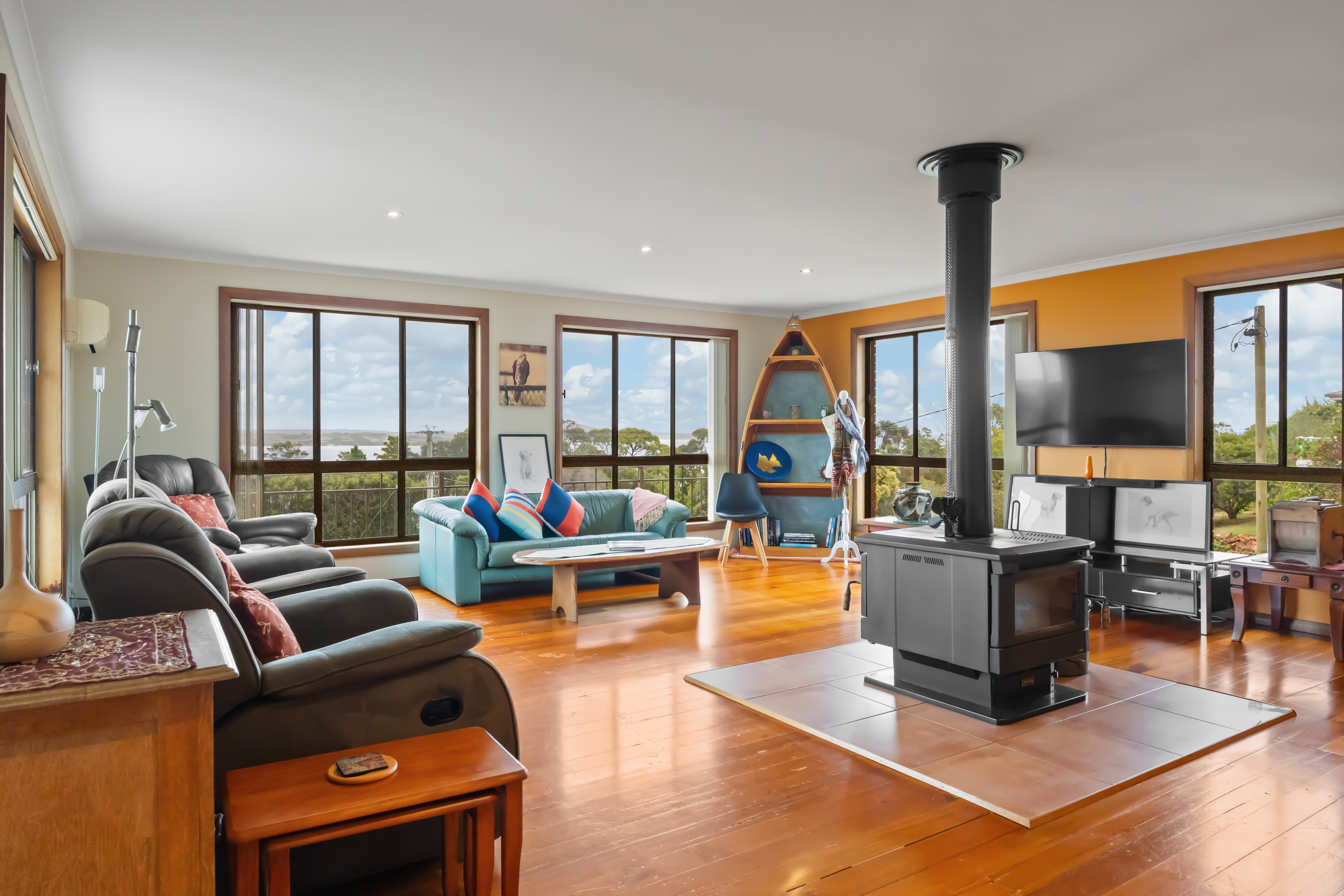 The living area is warm and inviting, featuring a Jindara double-door wood heater and air conditioning to ensure year-round comfort. Both the kitchen/dining area and living space have polished hardwood floors adding character to the home. The updated main bathroom includes a modern vanity, a generously sized shower, and a second toilet.