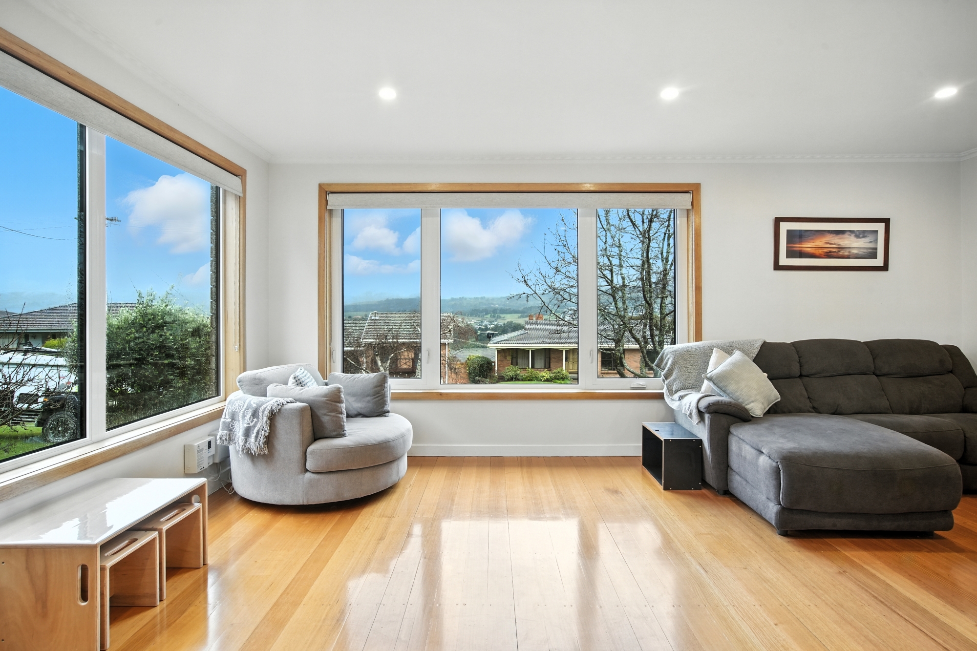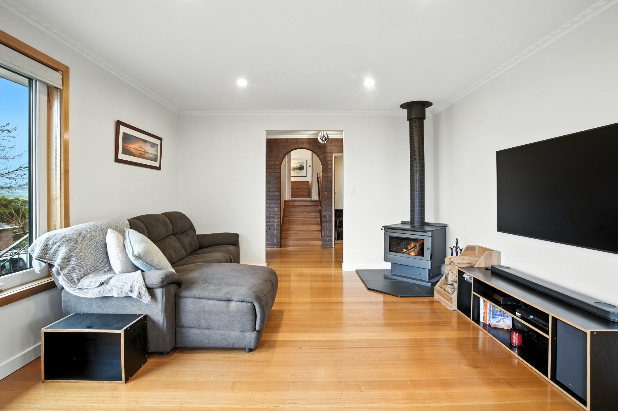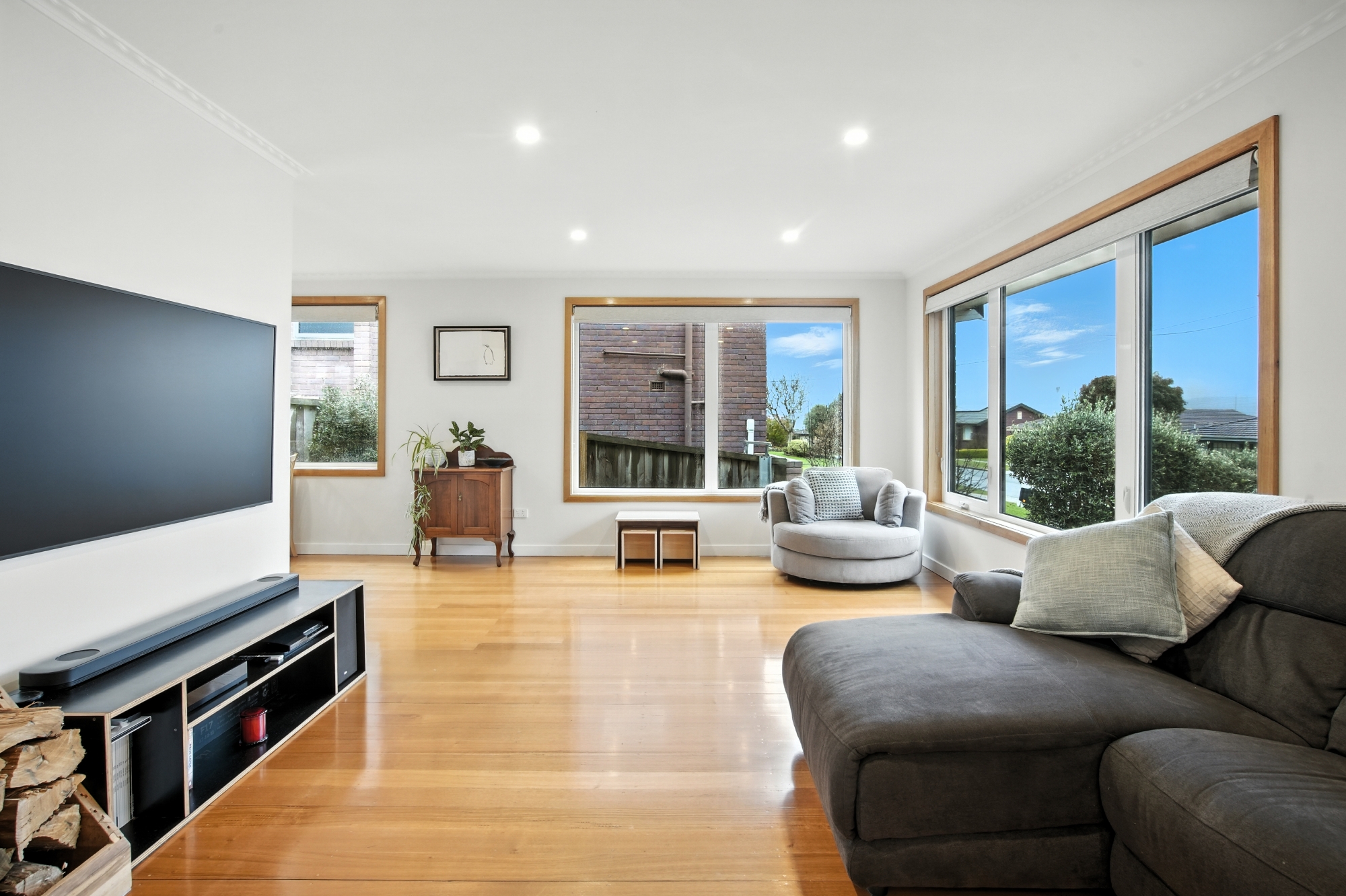 At the heart of the home is a modern open-plan living area, filled with natural light and finished with stunning Tasmanian oak floorboards, complemented by modern efficiencies which include uPVC windows and 8.88kW of solar panels.