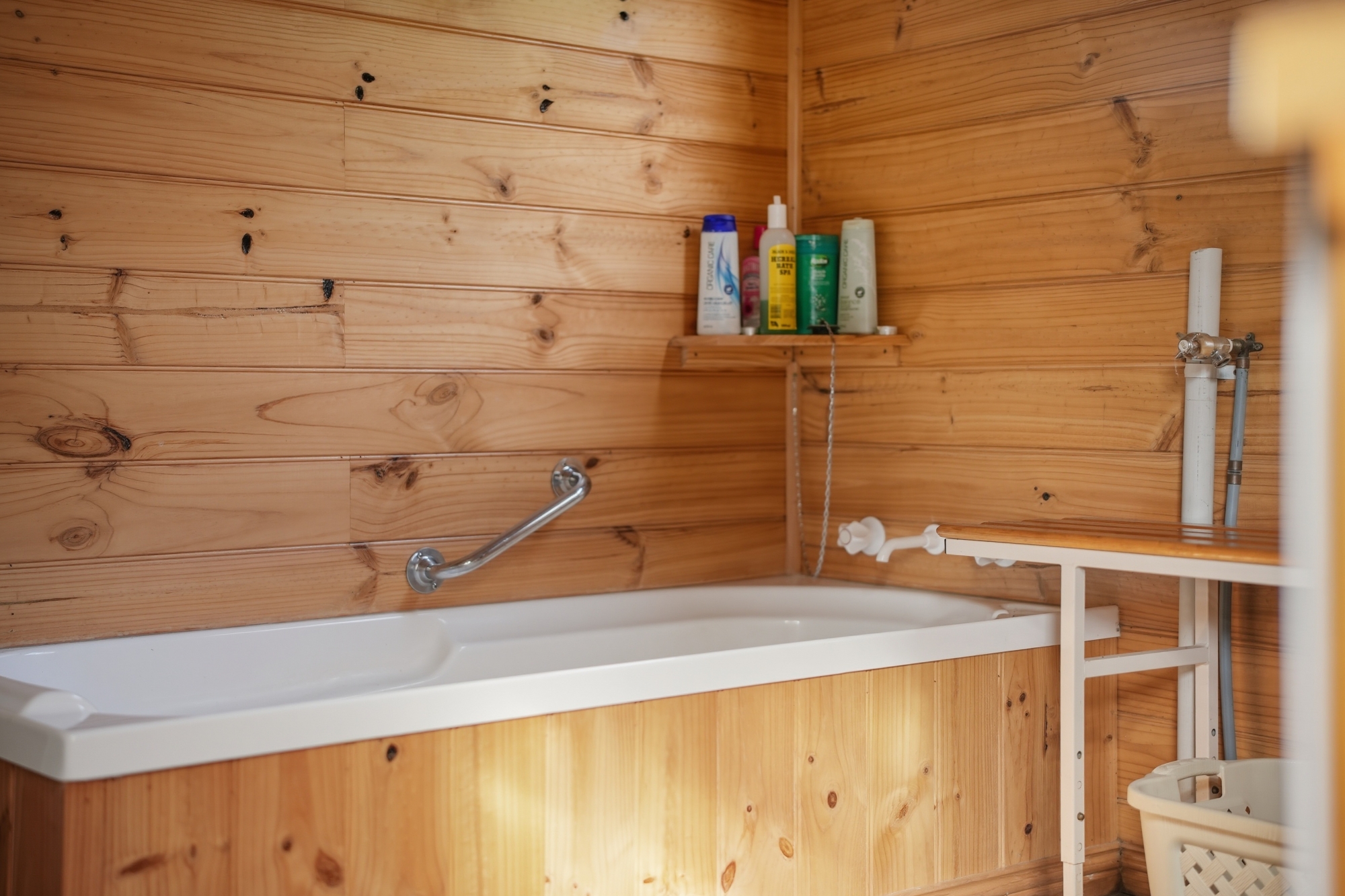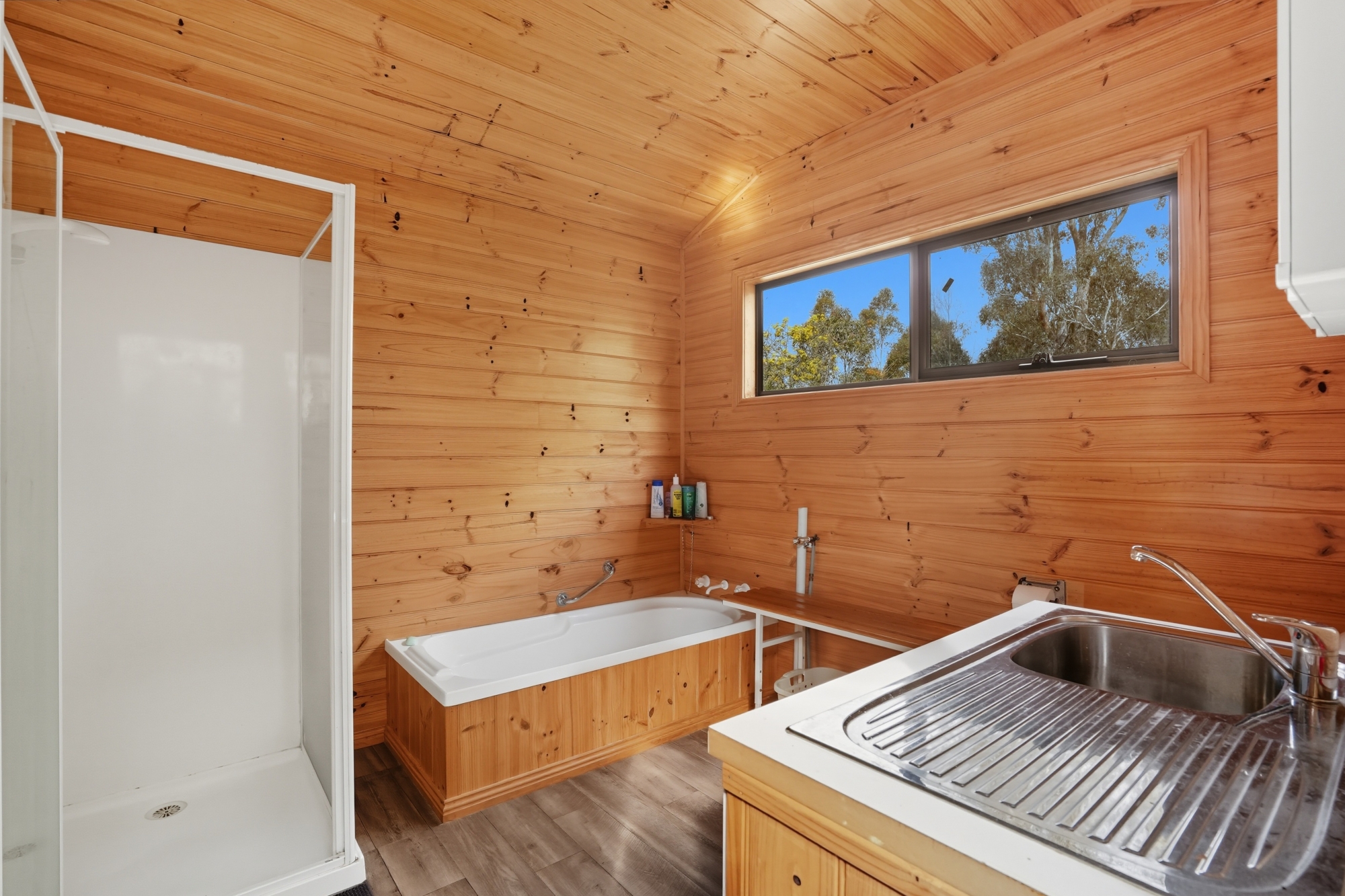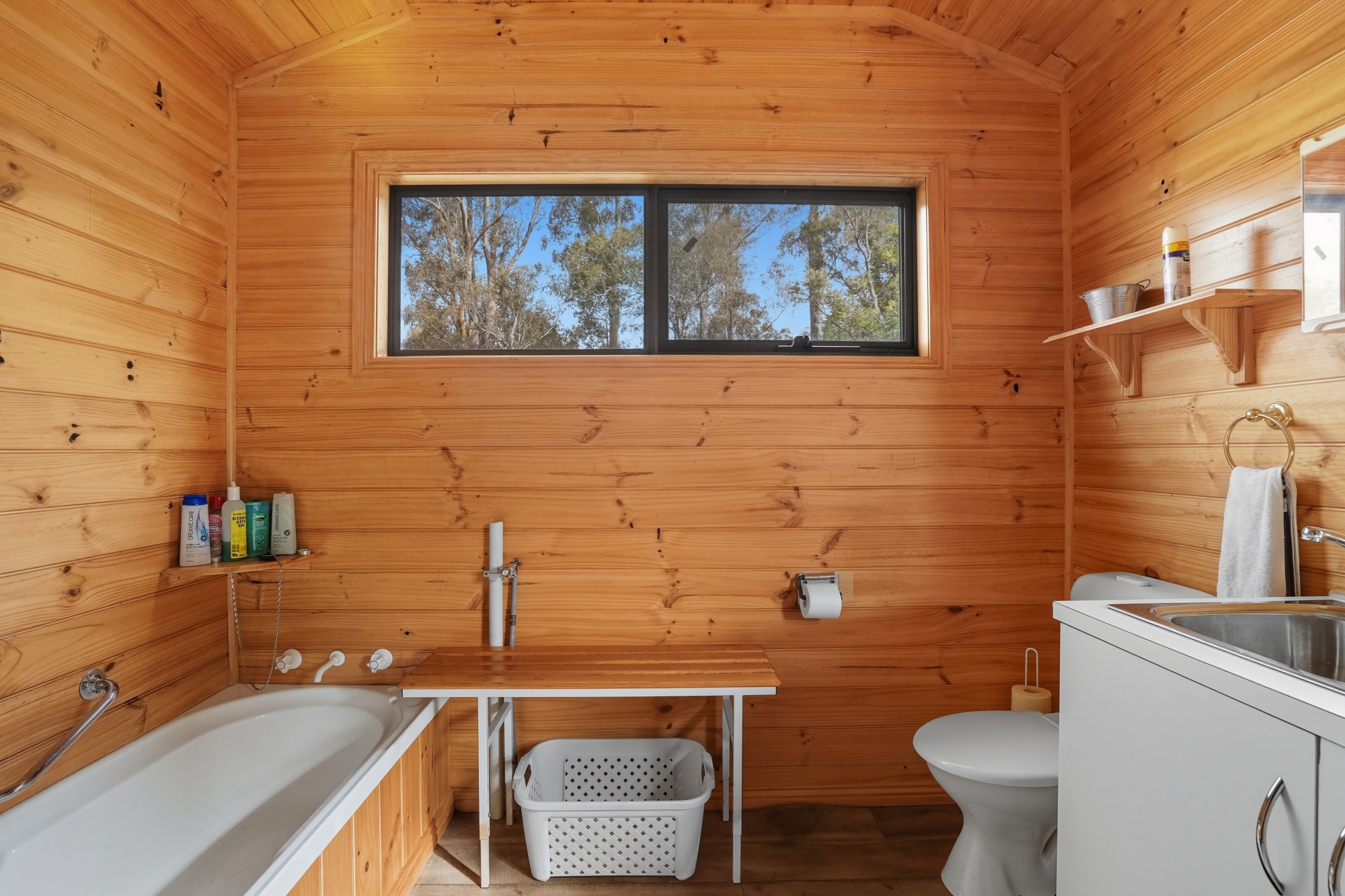 A detached timber lined bathroom offers a separate shower, bathtub, toilet and laundry space.