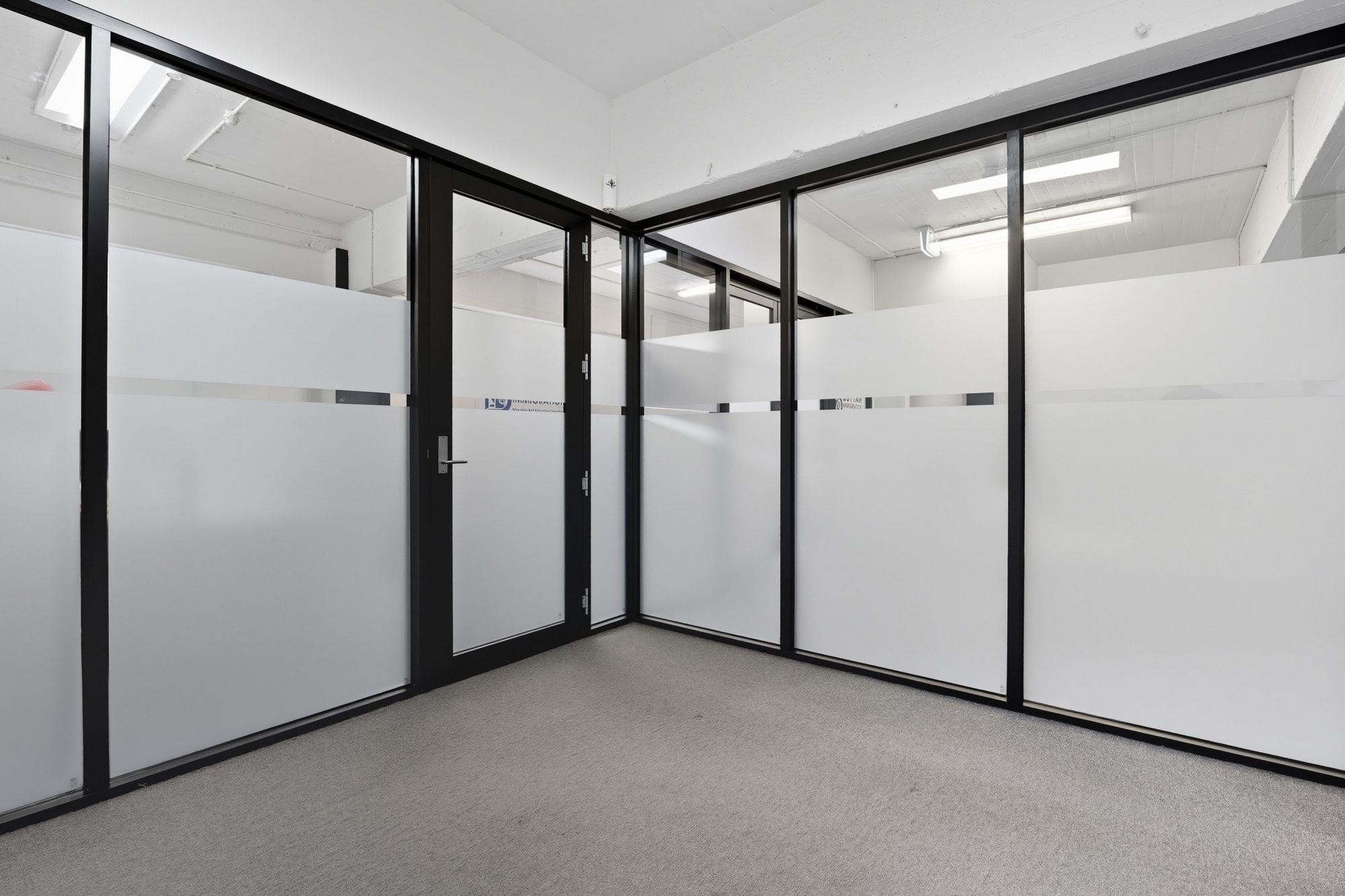 The layout is divided into two separate rooms, making it ideal for use as a reception area and private office or consultation space. Shared facilities are close by, including a kitchenette and bathroom amenities.