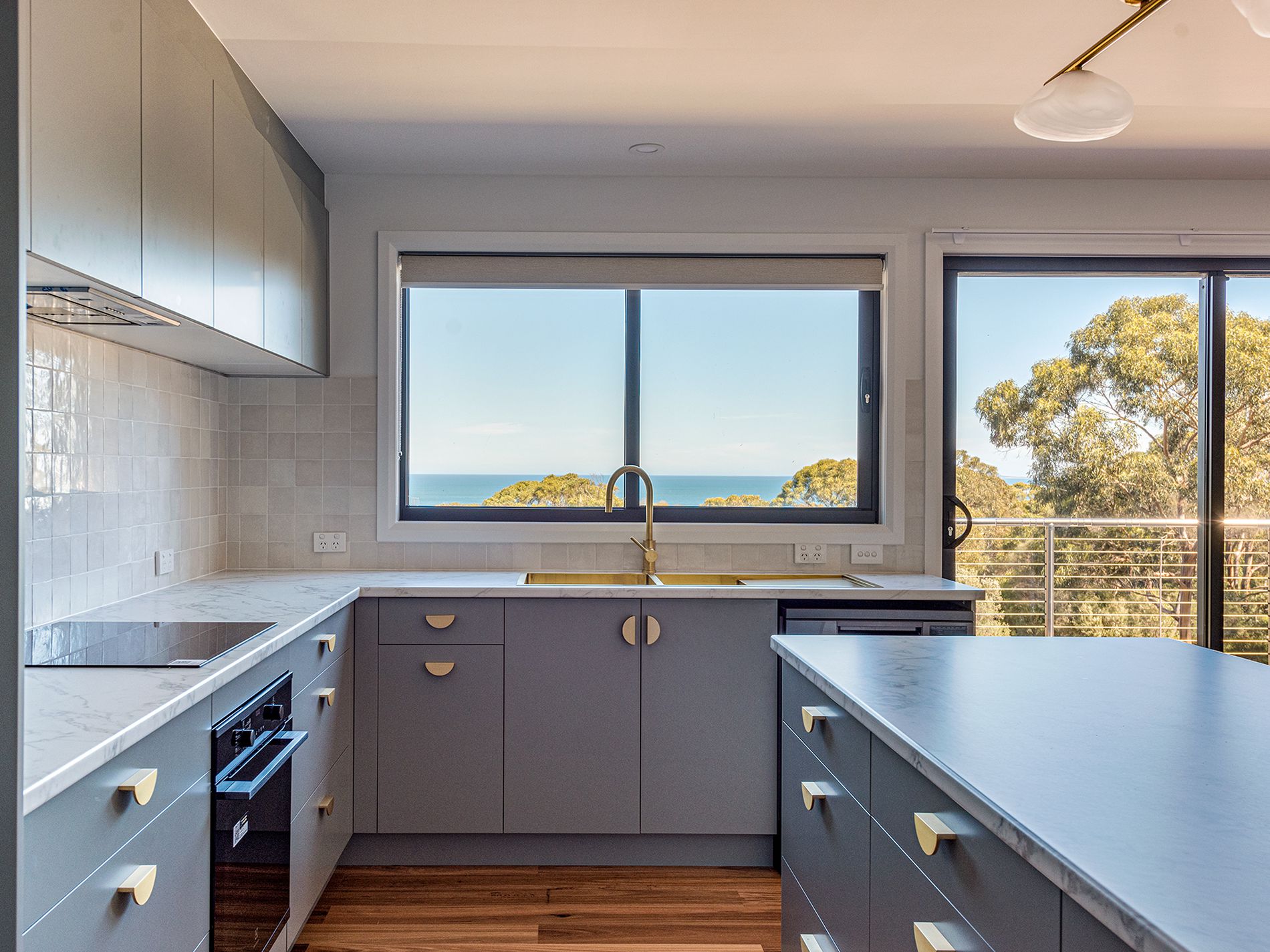 The kitchen captures lovely sea views — a daily reminder of the island’s incredible natural beauty.