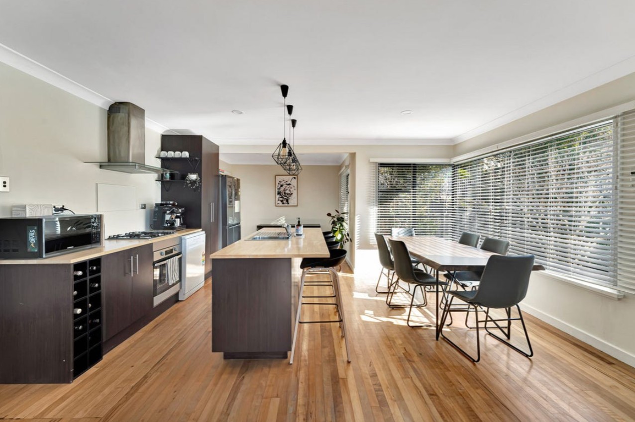 The modern kitchen provides you with a large island bench perfect for casual dining, a gas cook top with the adjoining sitting area opening to a sunny deck and private backyard — ideal for entertaining or relaxing outdoors.