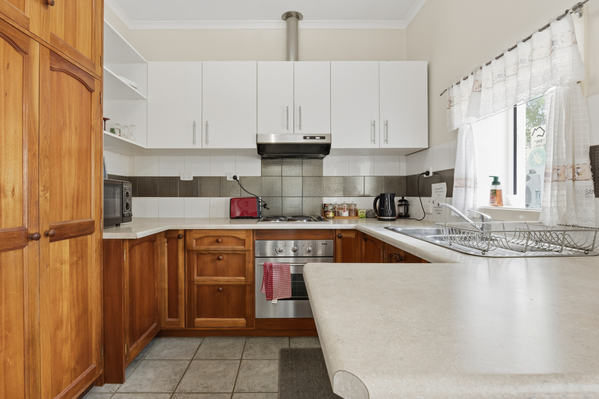 The kitchen features loads of cupboard space, a large pantry and a small breakfast bar.