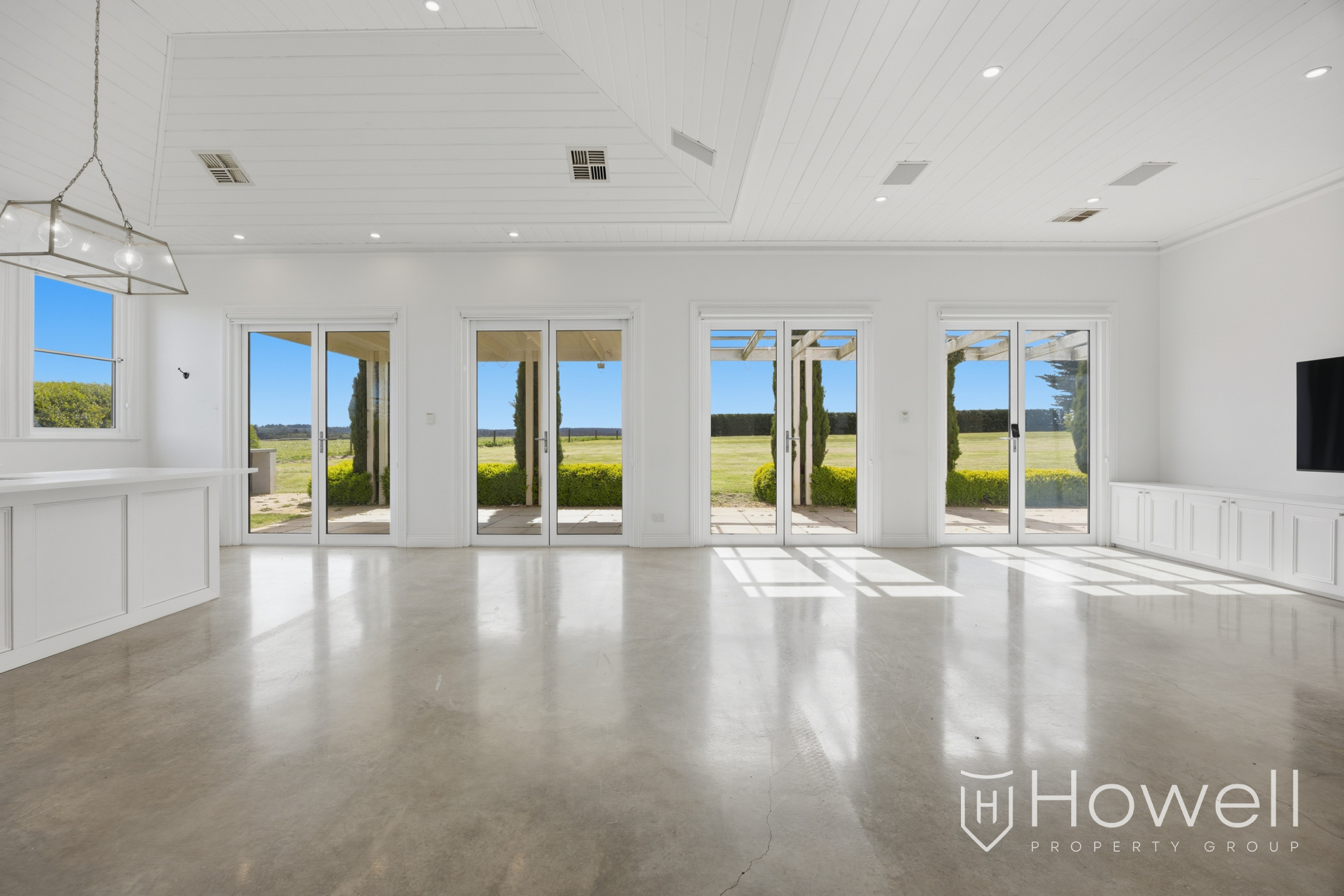 Polished concrete floors sweep through the kitchen and living areas — beautiful to look at and wonderfully hard-wearing and easy to care for — all set beneath striking vaulted, timber-lined ceilings.