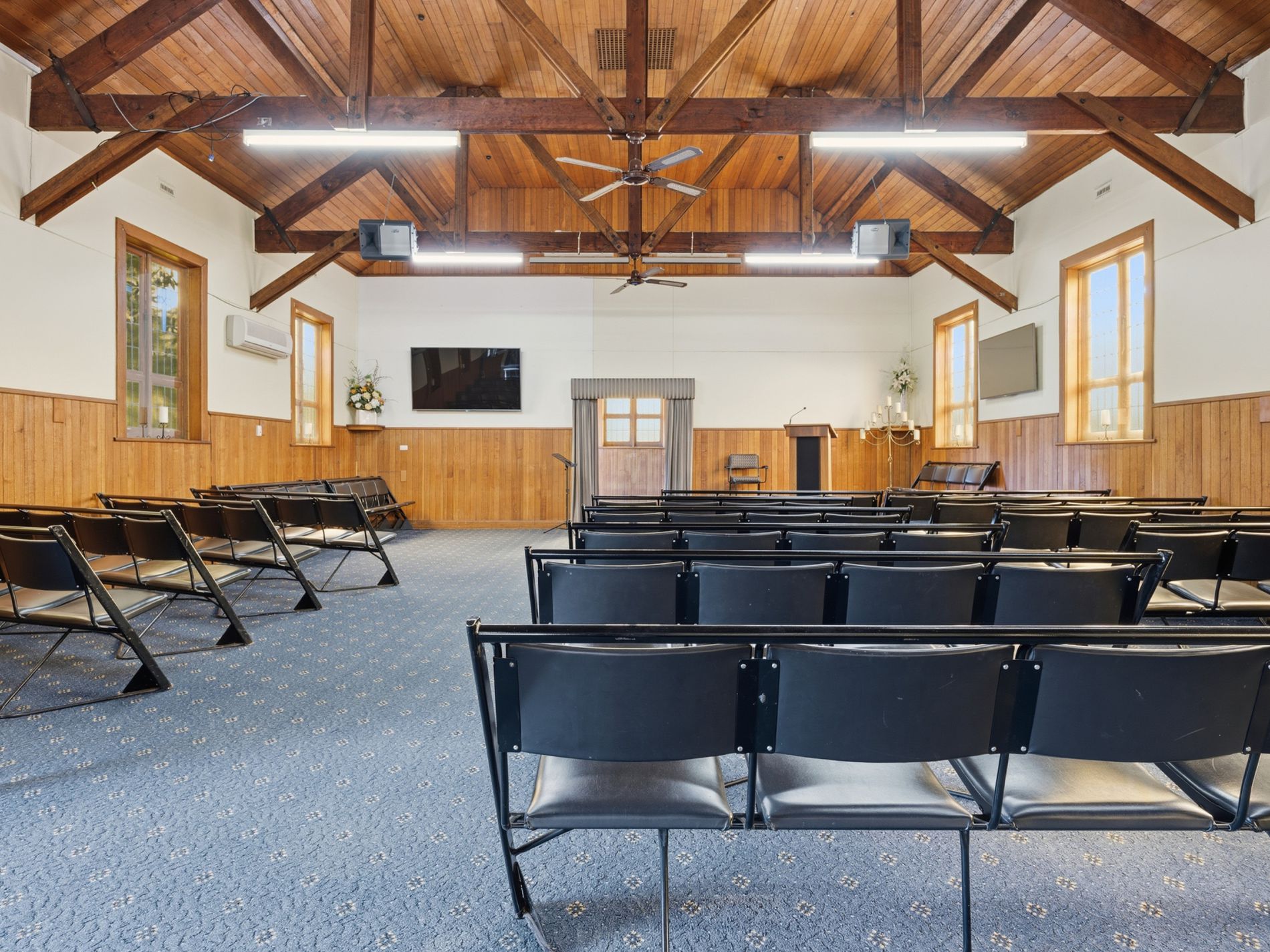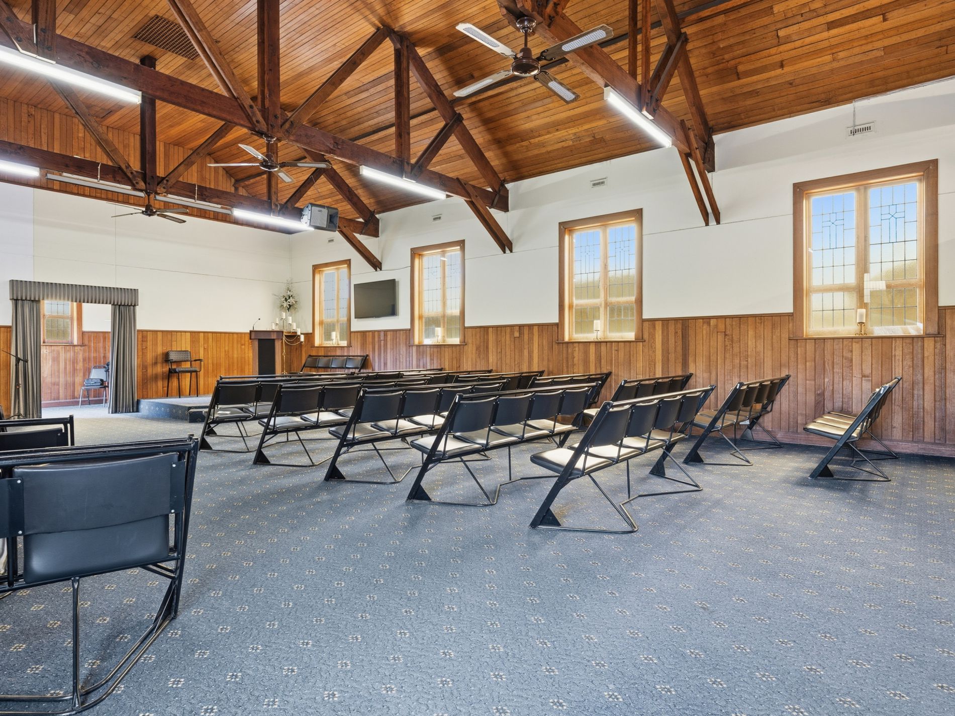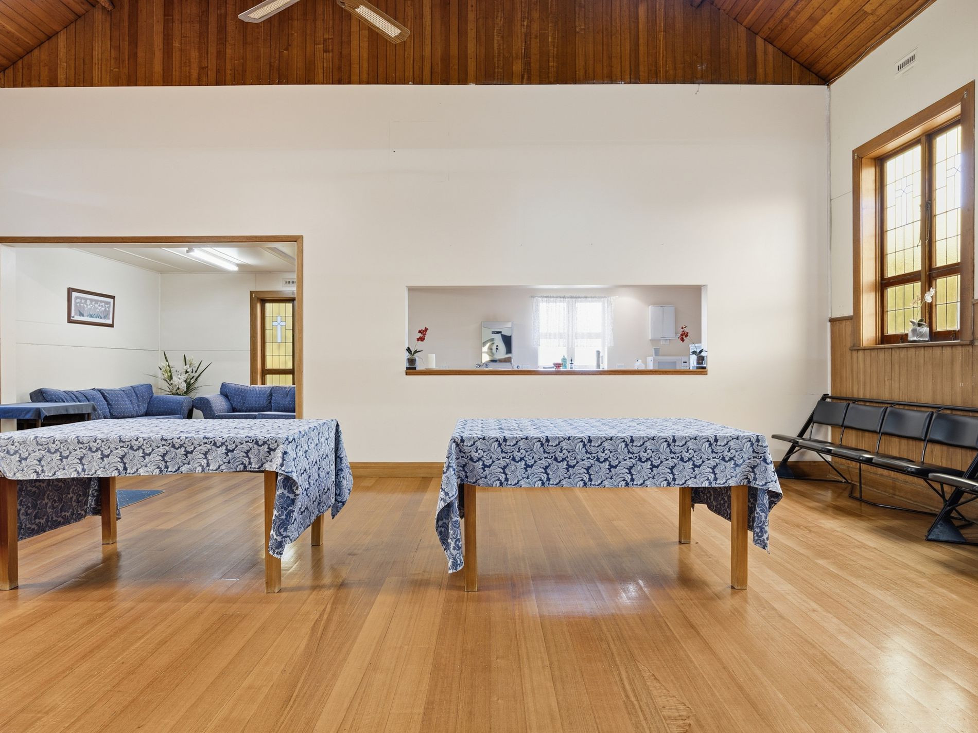 The existing 235m² building is positioned centrally on the northern lot and offers a functional layout complemented by multiple heat pumps, kitchenette facilities, toilet amenities, and a charming chapel-style interior featuring attractive timber ceilings with exposed beams.