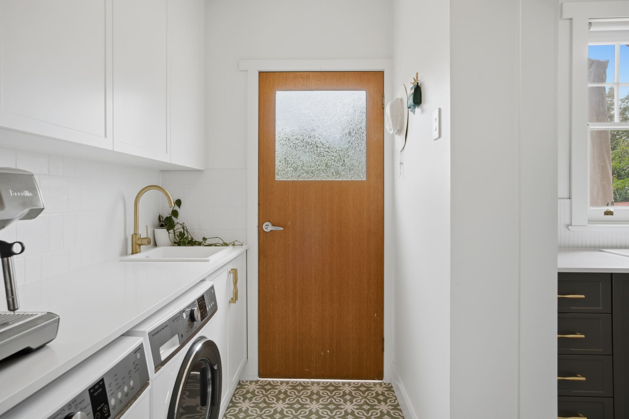 A full-sized laundry includes a Fisher & Paykel front-loading washing machine and dryer. Outdoors, the expansive deck overlooks the rear yard and provides a lovely space to soak up the morning sun.