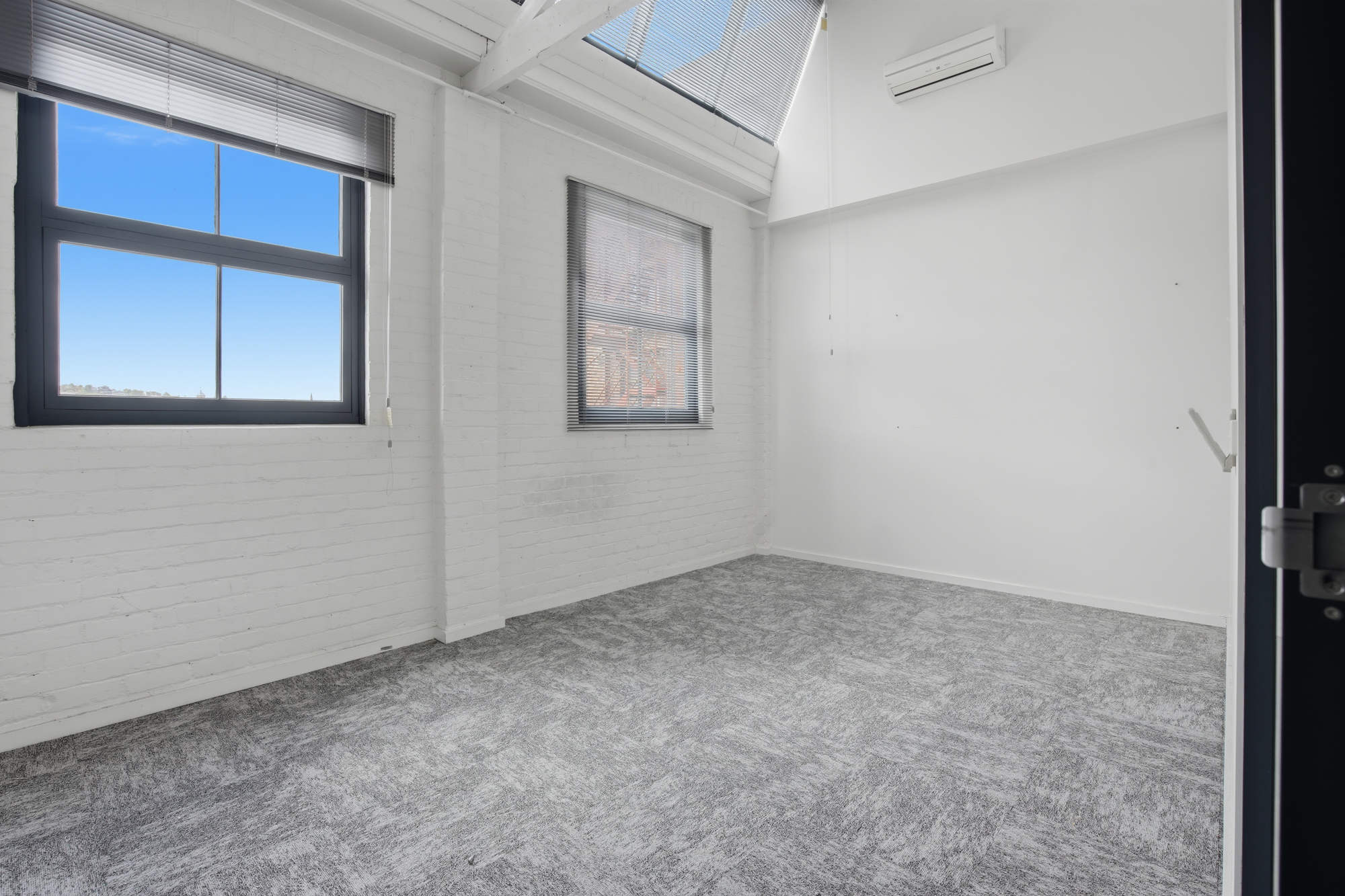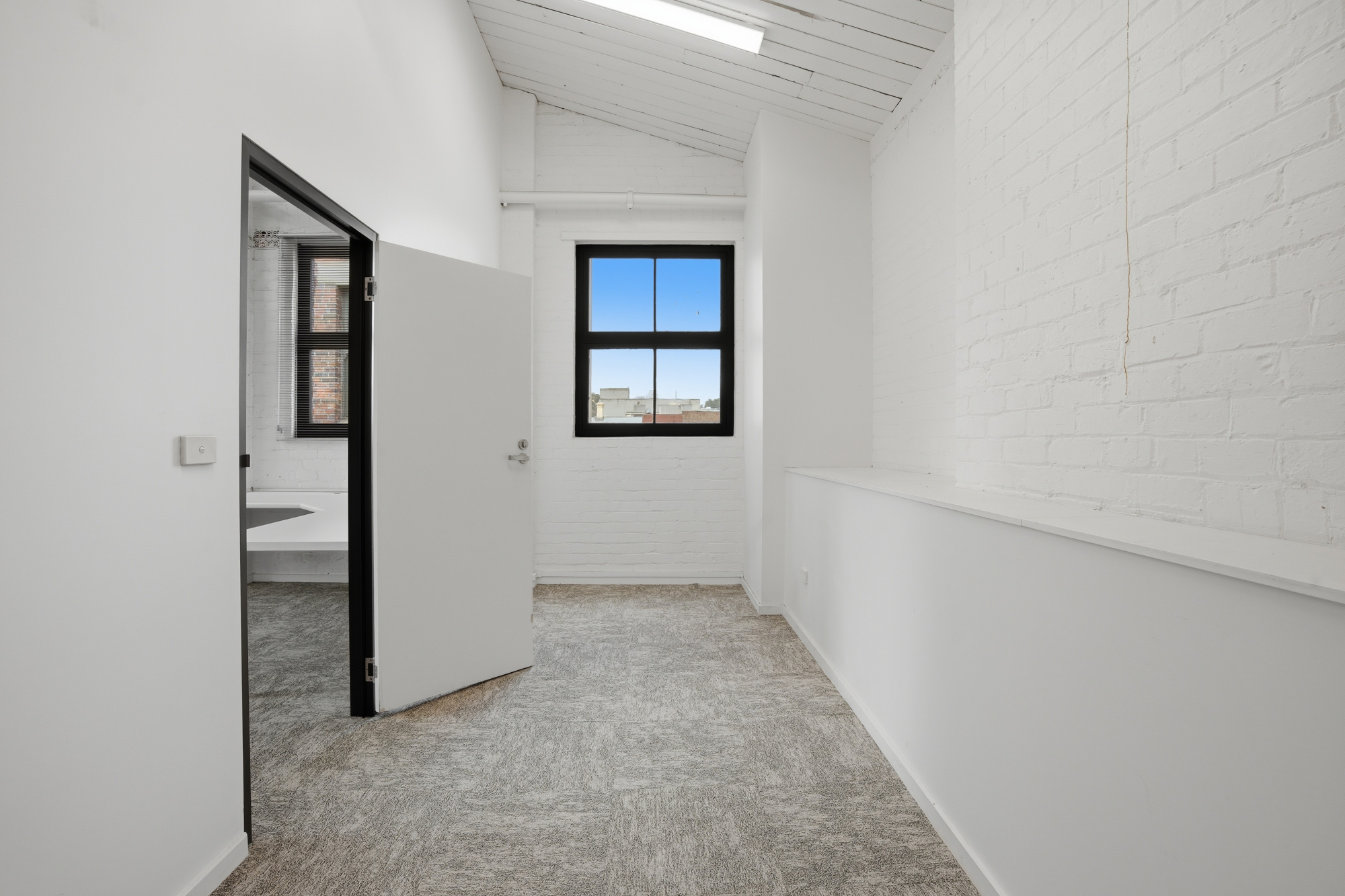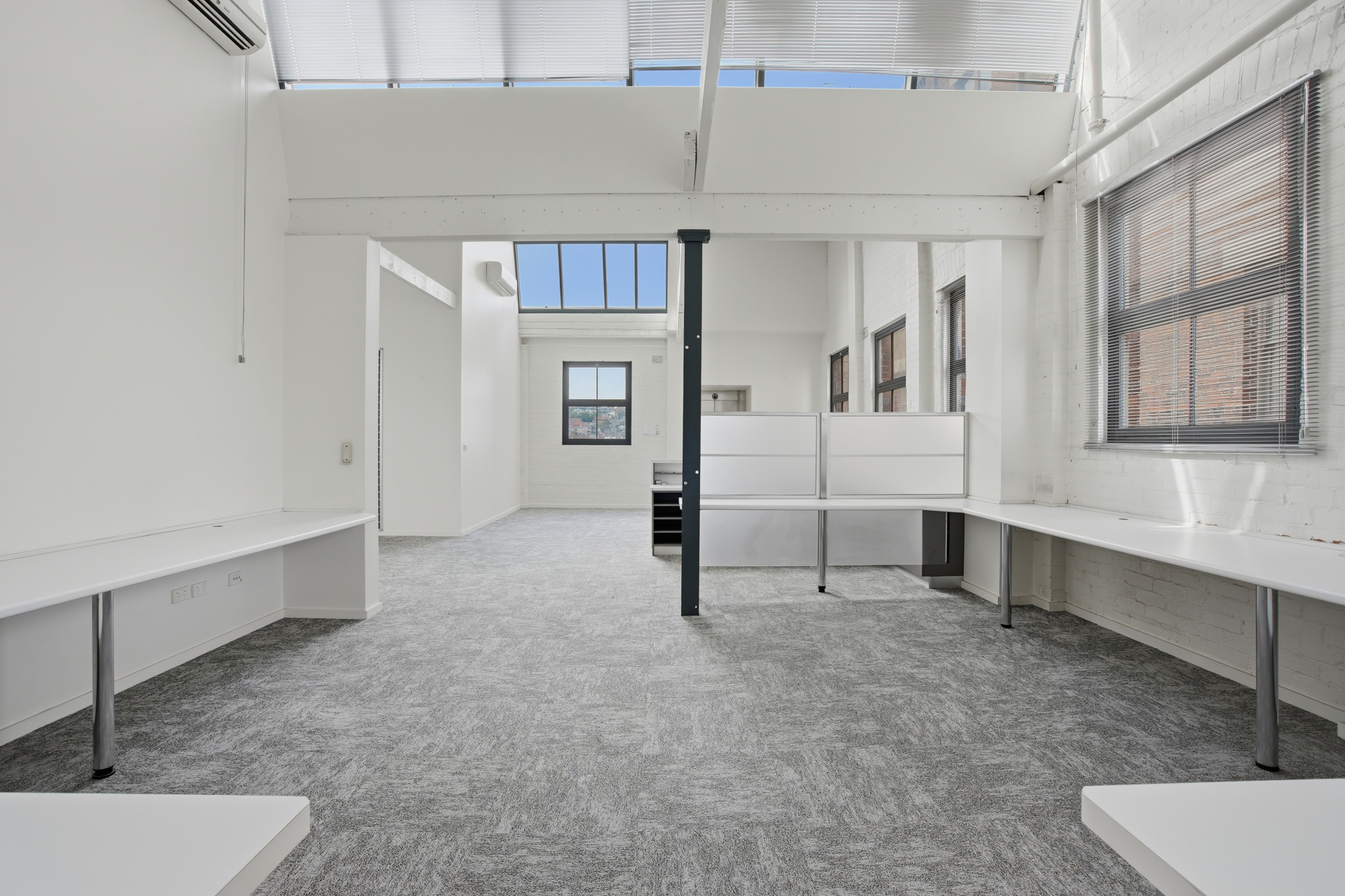 Lift access opens to a generous, light-filled entrance, with extended ceiling heights and skylights creating a bright and welcoming working environment. The layout offers an expansive open-plan workspace with built-in desks already insitu, complemented by six individual offices or meeting rooms—ideal for businesses requiring a mix of collaboration and privacy.