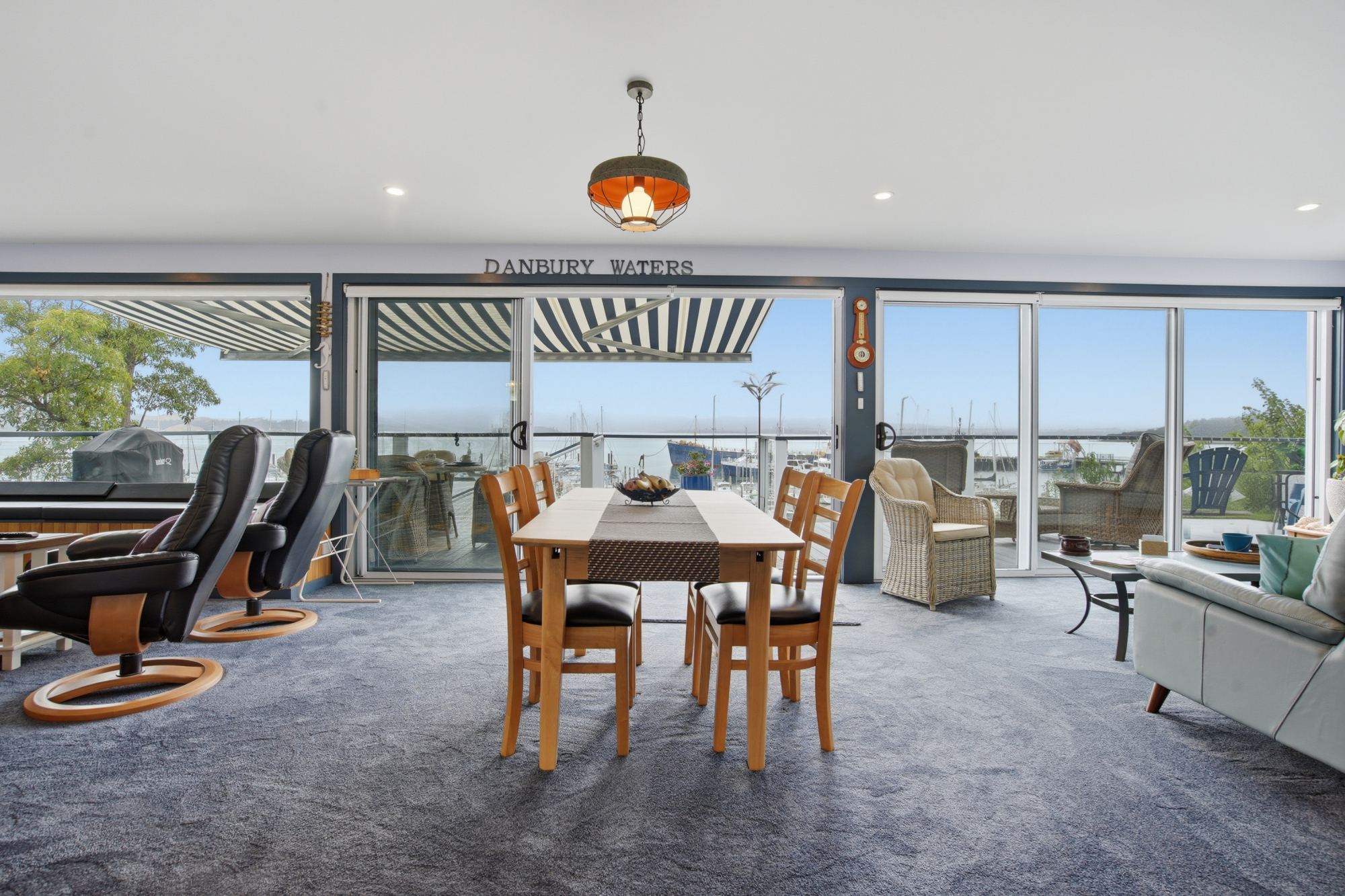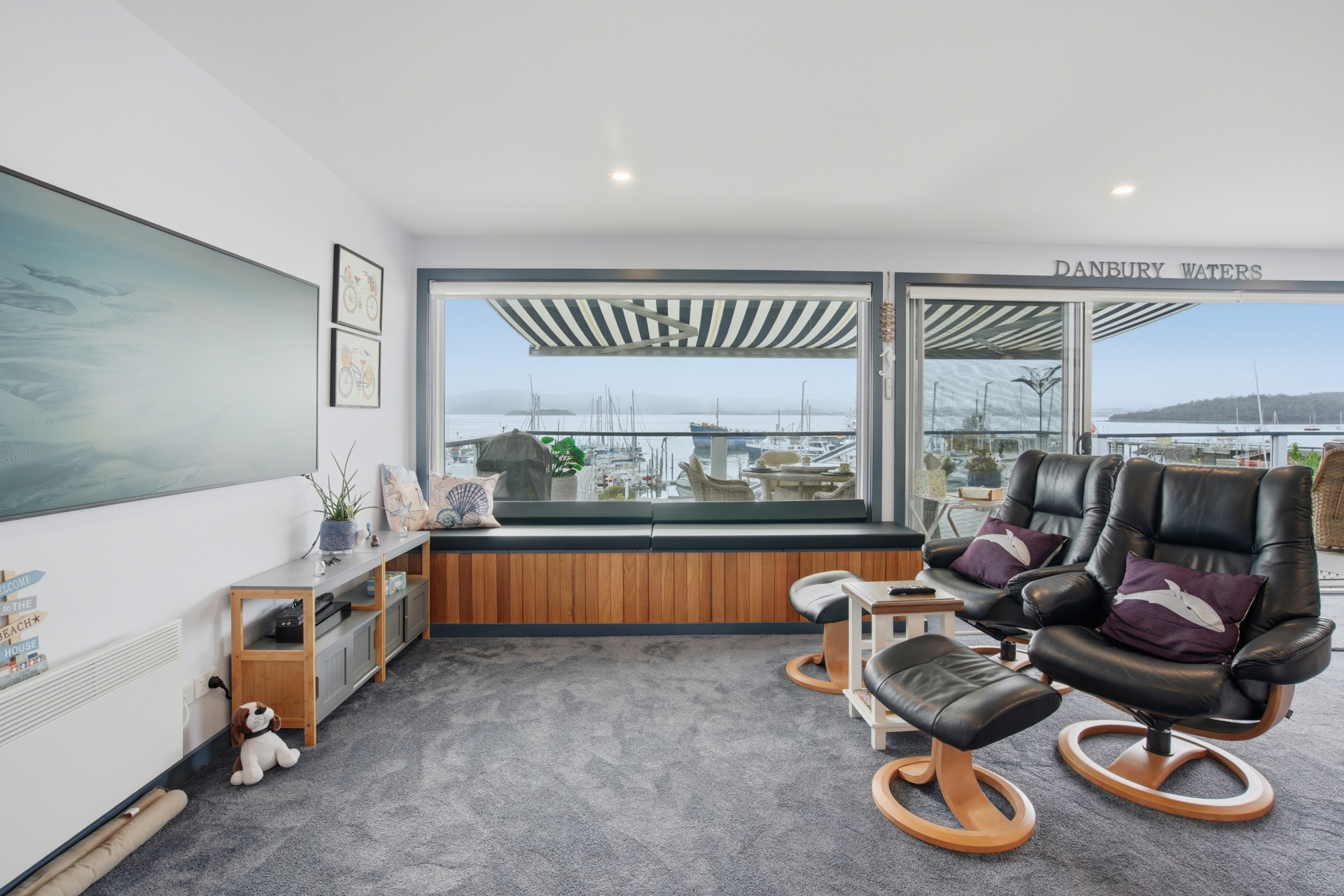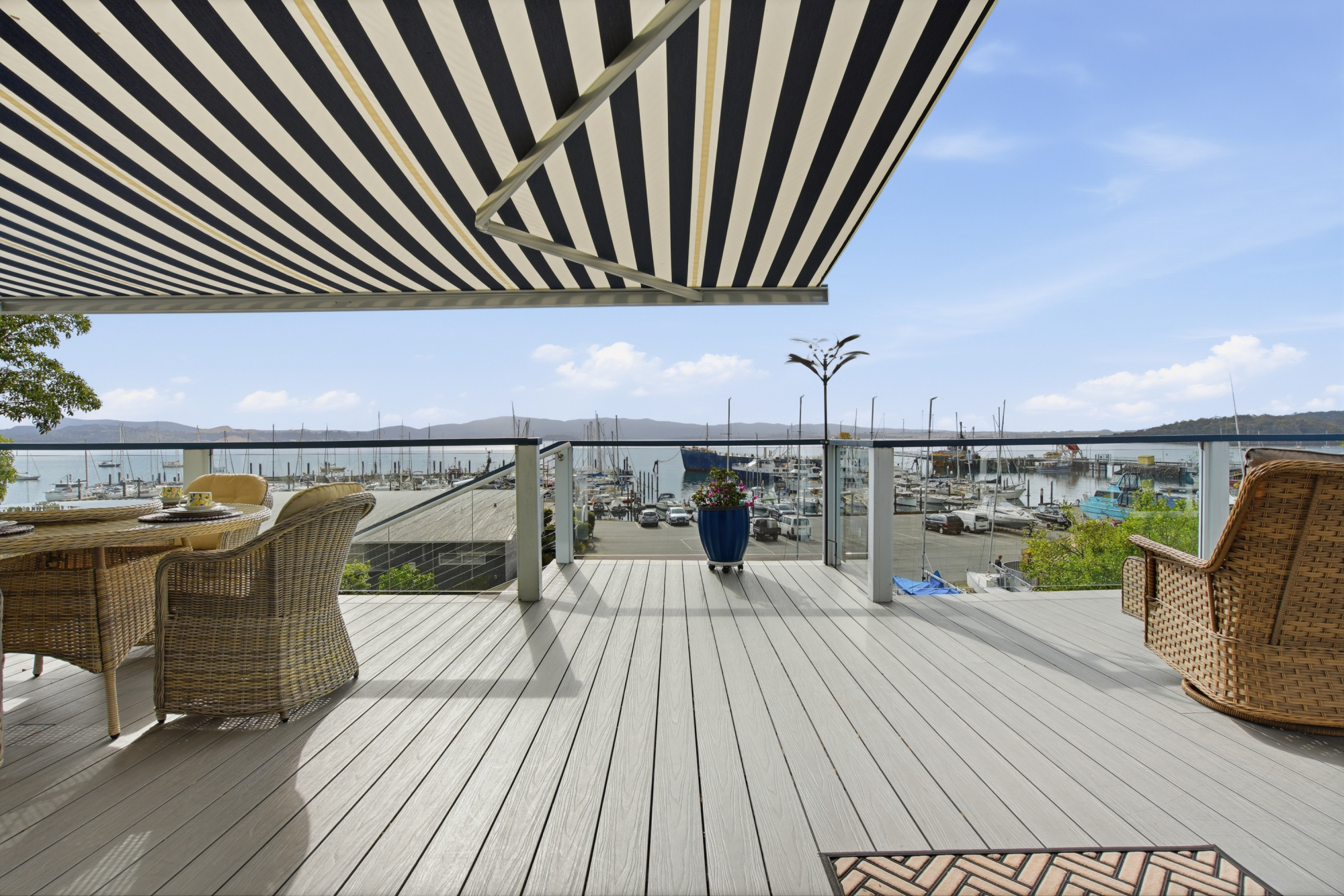 Step outside to a fantastic entertaining deck where you can BBQ in style and watch the boats sail by. The space is partially covered by an automatic awning, providing shade and flexibility for year-round outdoor enjoyment.