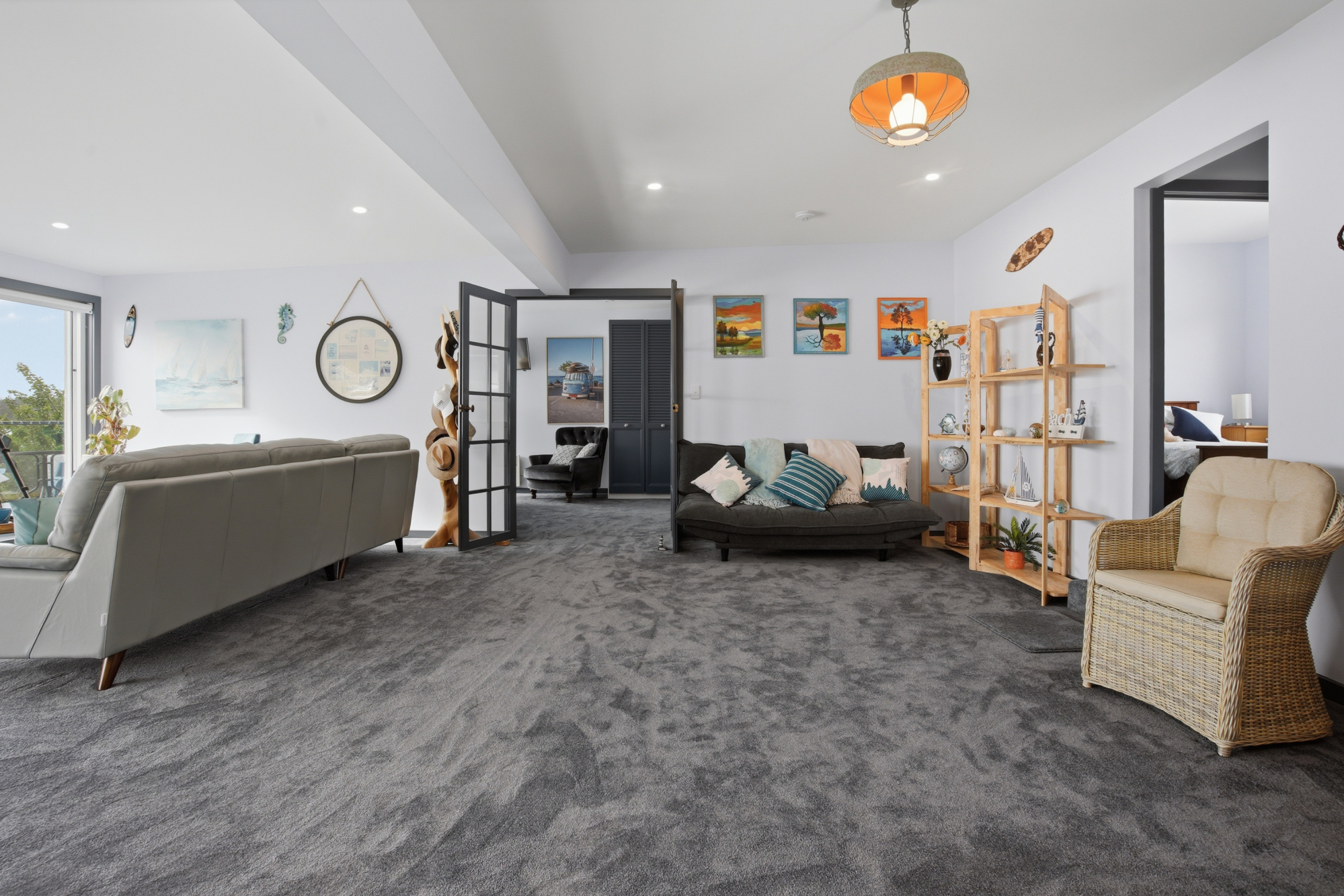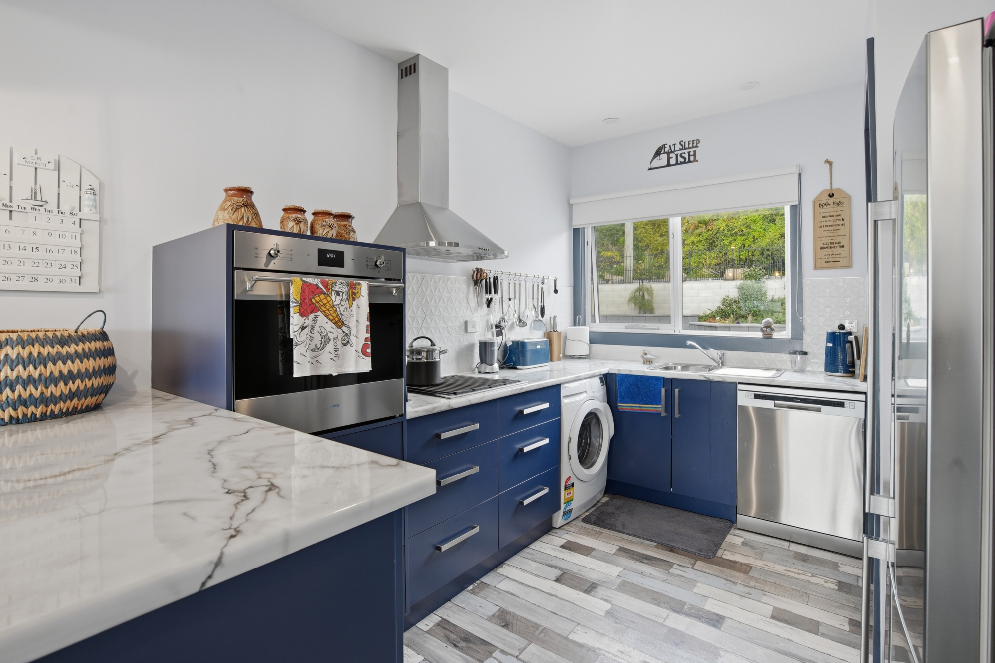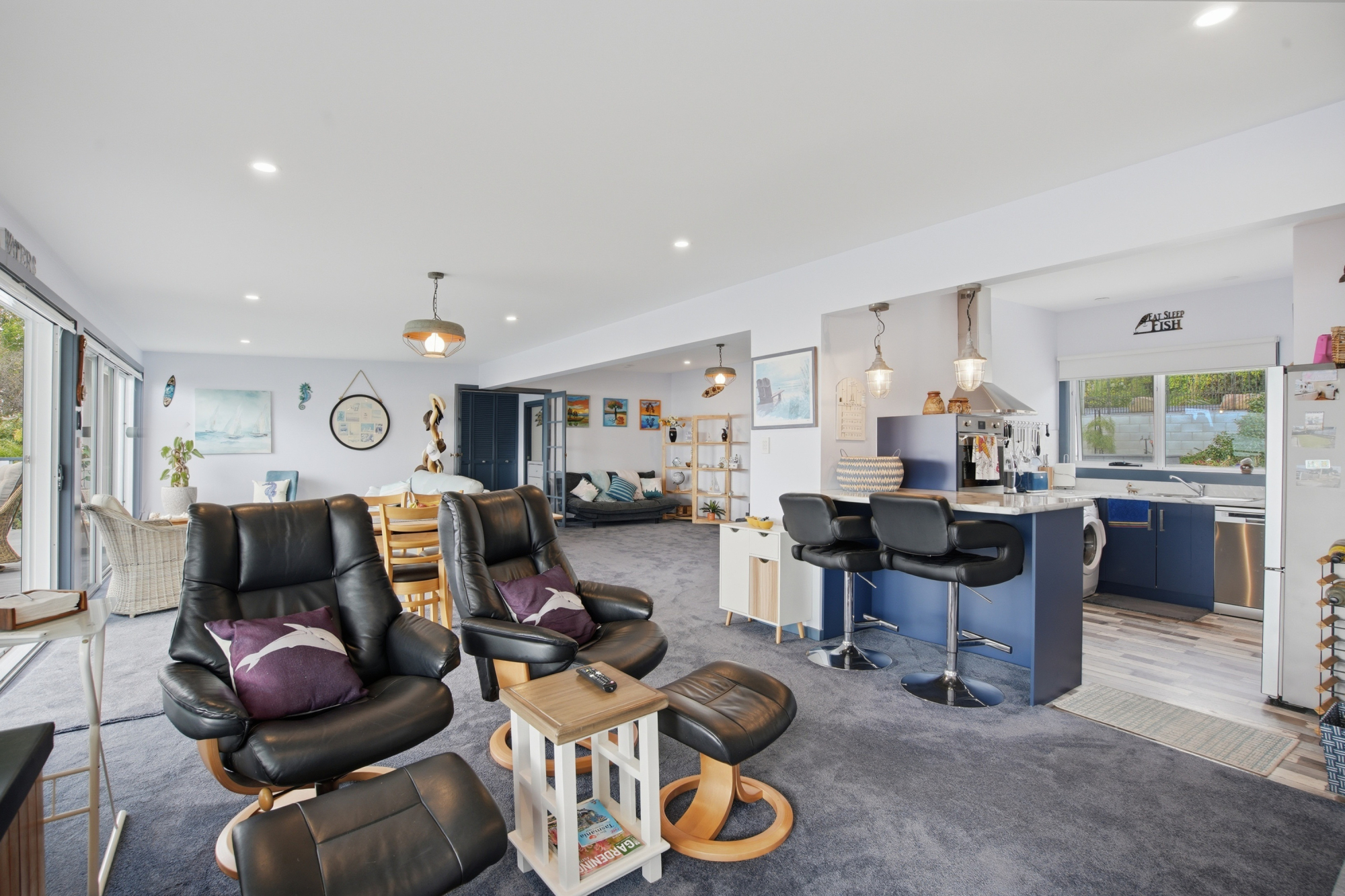 A spacious open-plan layout inside has the living, dining and kitchen areas all within reach of the watery blue outlook.