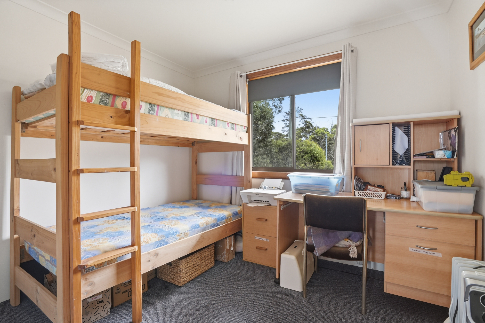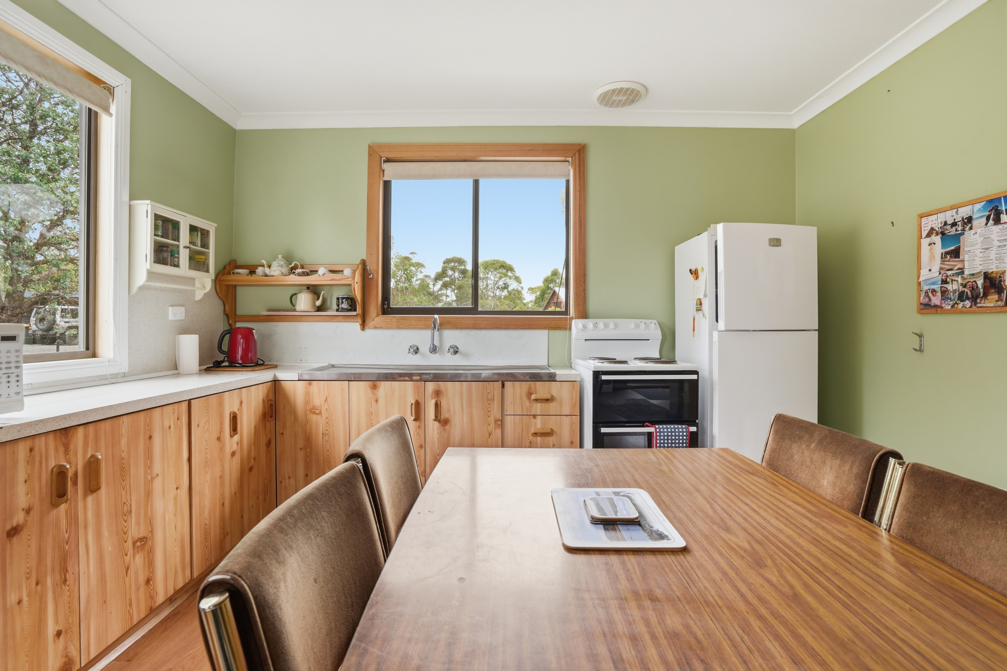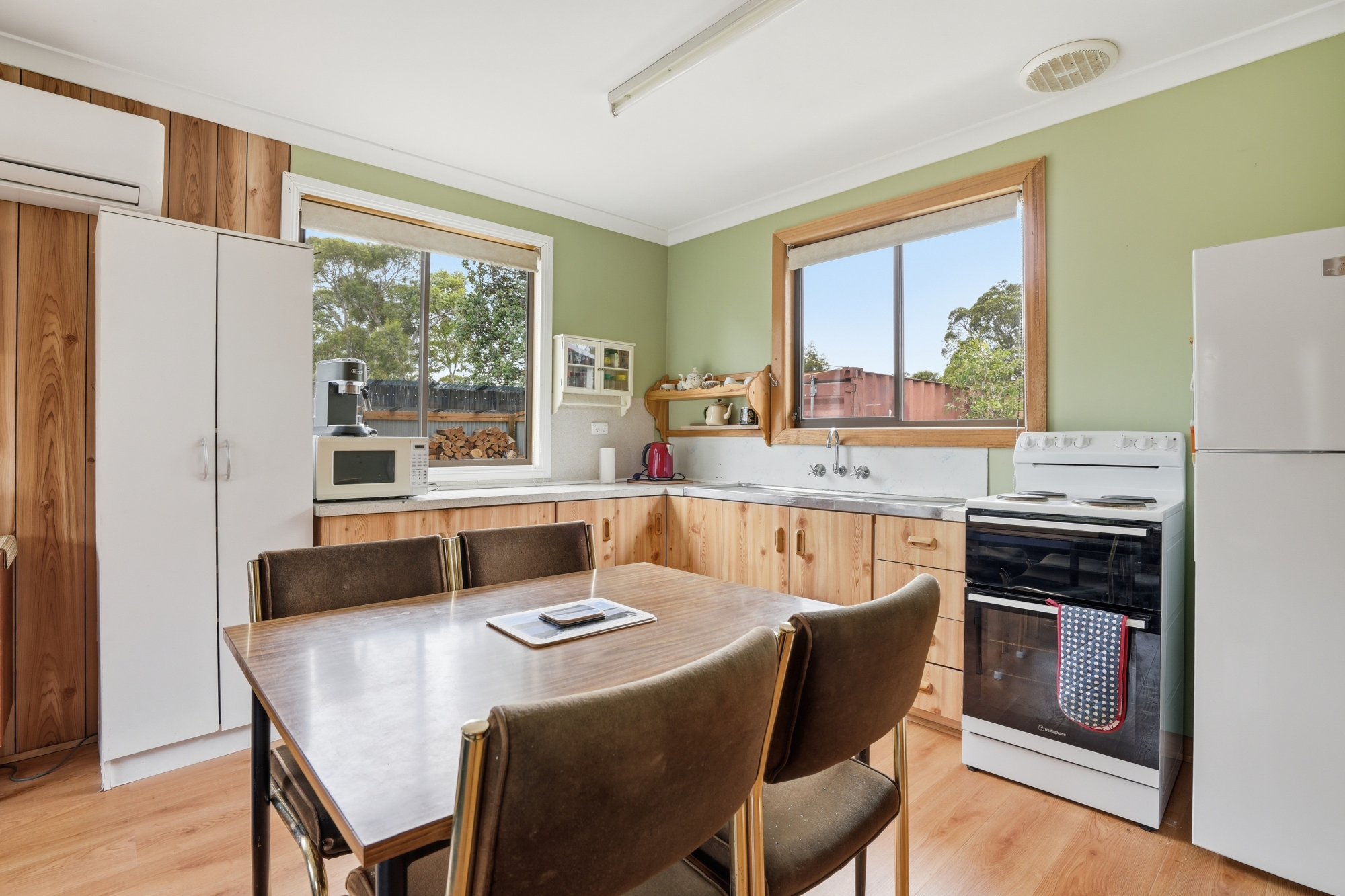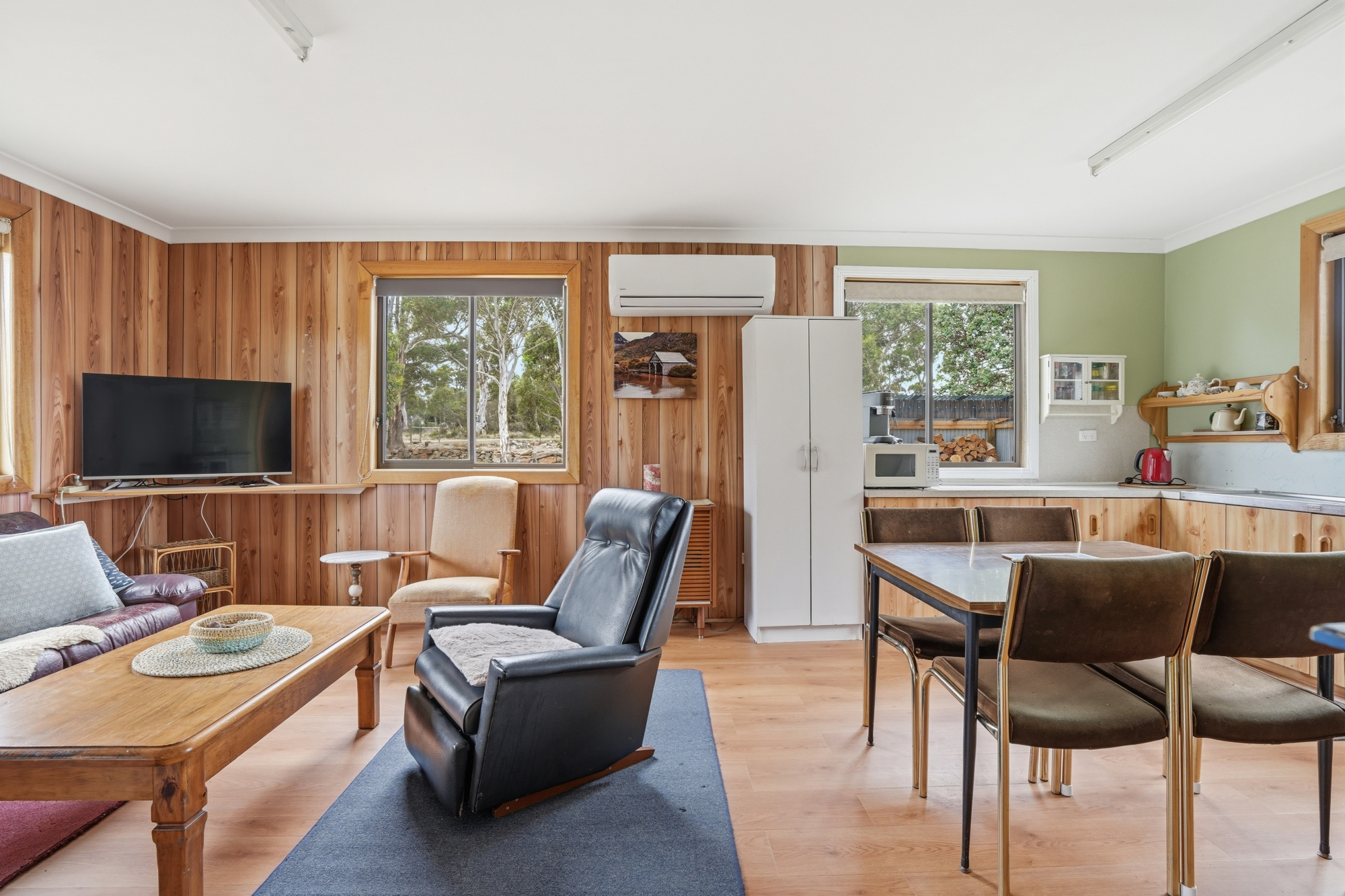 The home itself is warm and inviting, with a practical design centred around a timber lined open-plan living, dining and kitchen area that forms the heart of the residence. Updated appliances include free-standing oven, fridge and air conditioning plus a freestanding wood heater adding warmth and atmosphere during the cooler highland months.