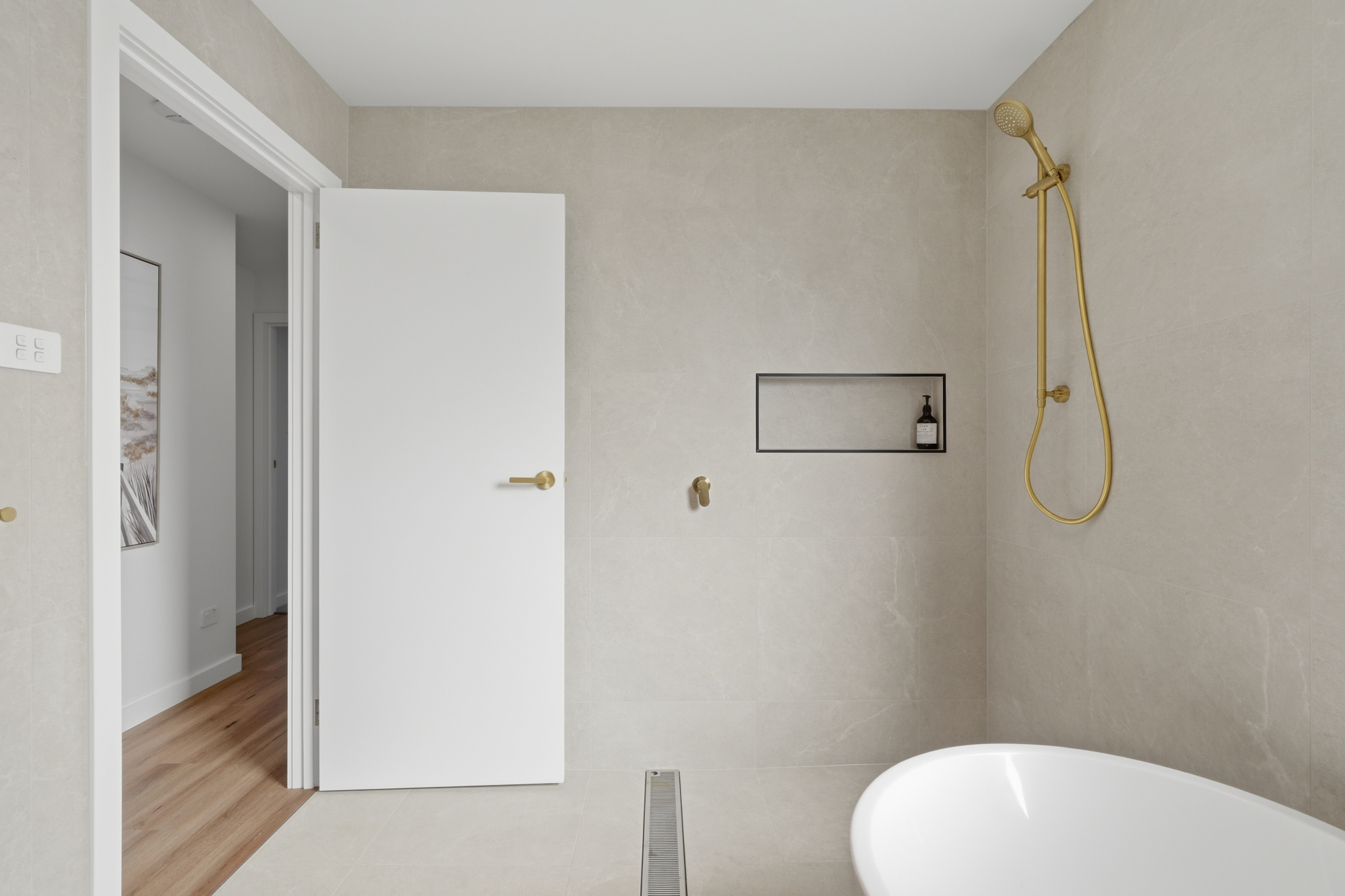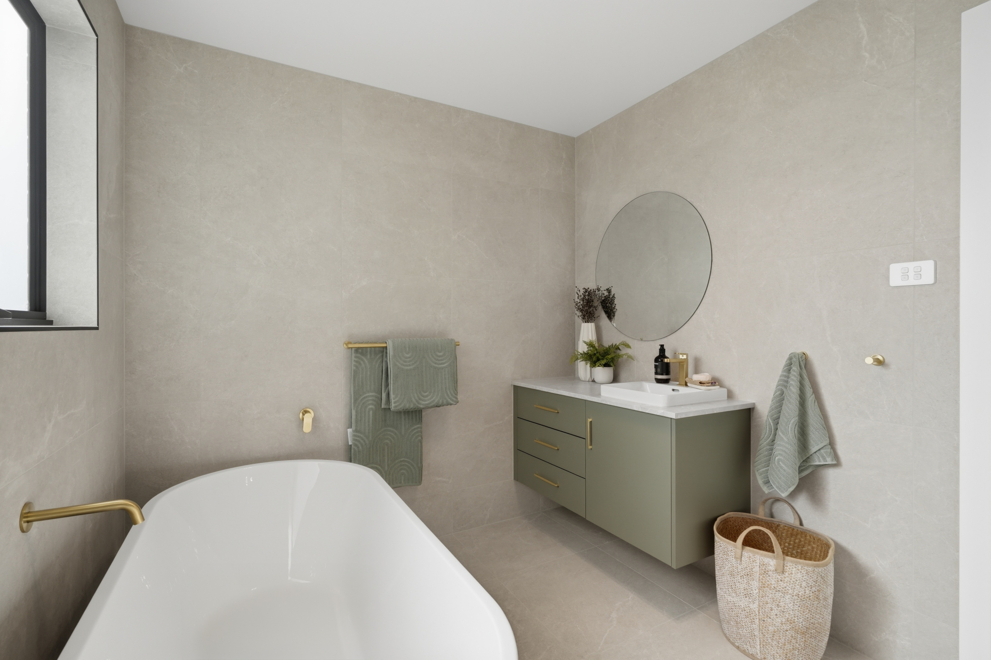 Both bathrooms are fully tiled and finished in a timeless, neutral palette. The family bathroom is particularly inviting with its freestanding bath that adds a touch of everyday luxury.